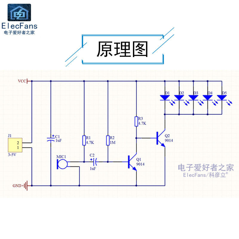 [本套件制作成功后5只LED会随着音乐或是其它声音的节奏闪动起来,可放置于音响附近,让灯光为音乐伴舞!]