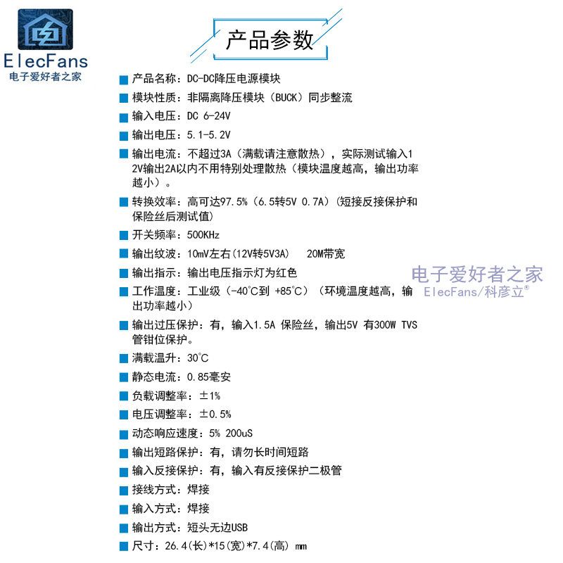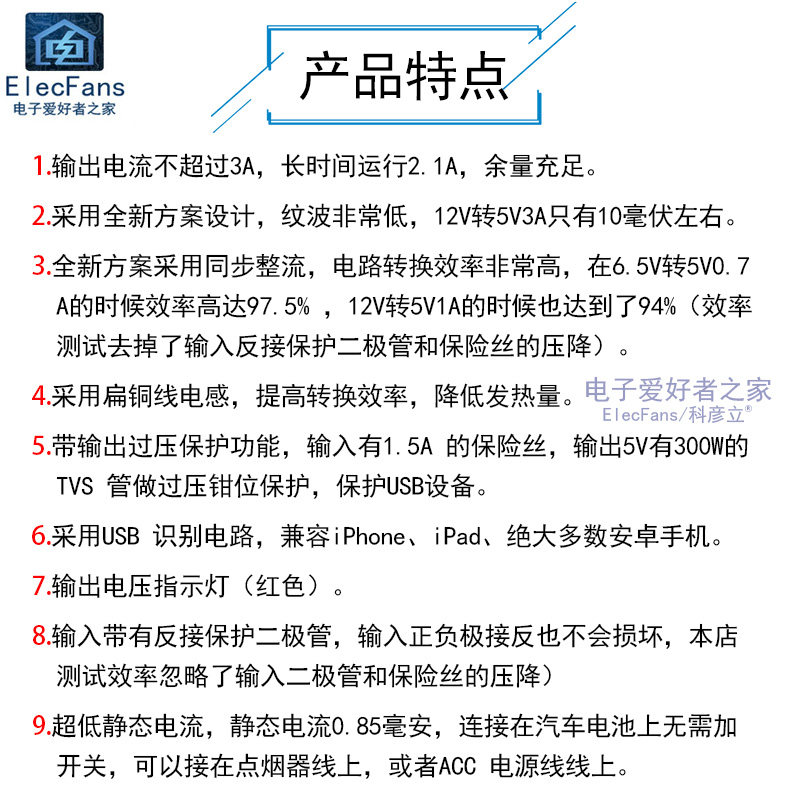 Эффективность конверсии: до 97,5%(6,5 об / мин 5 В 0,7a) (короткая обратная защита и тестовая тестовая значение)