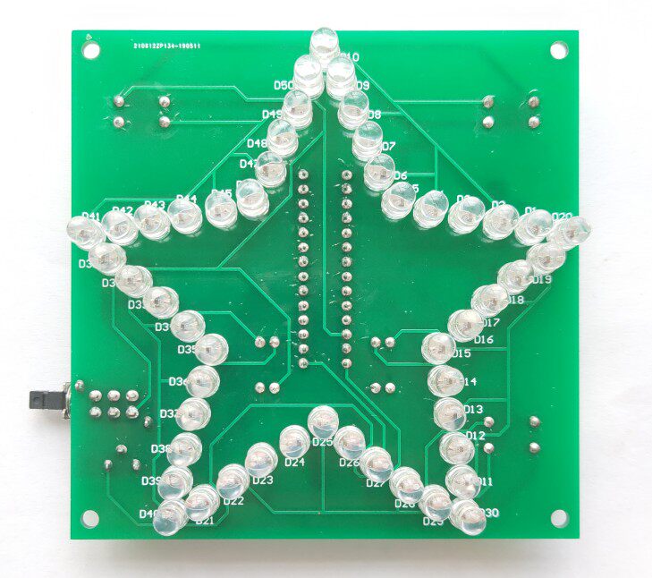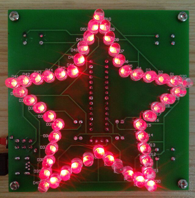 &[nbsp;50个七彩LED排列成五角星的图案,在单片机程序的控制下,呈现多姿多彩的变化。用来自己欣赏和作为礼物送人都是不错的选择。单片机发货前已烧录好程序,焊接好即可通电使用。适用于单片机电子爱好者及创客,提高对单片机的兴趣和焊接基础。]