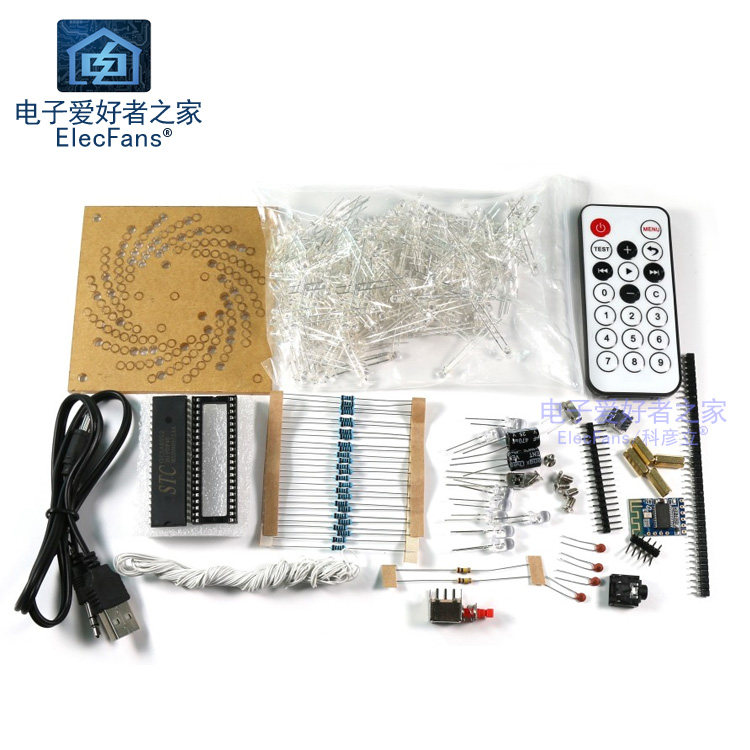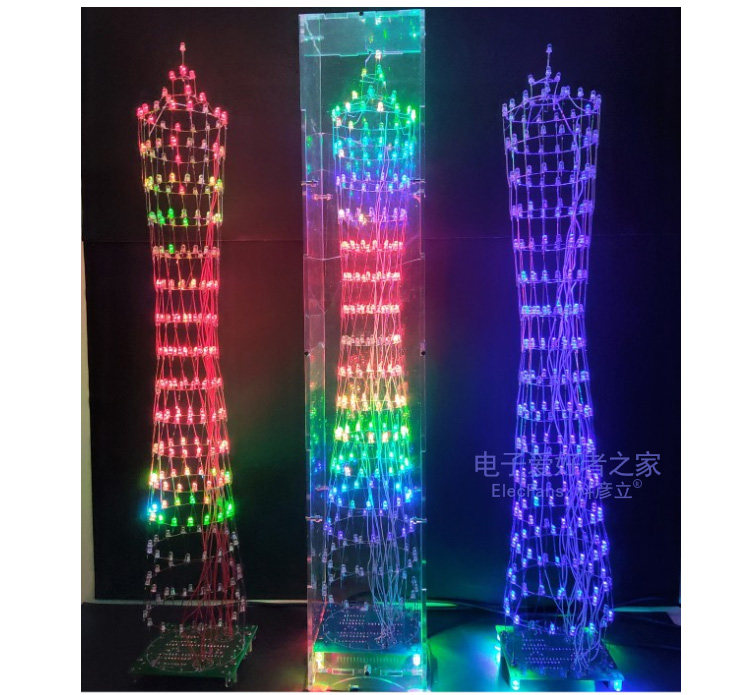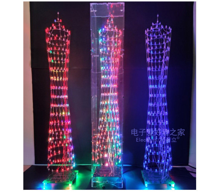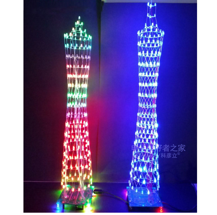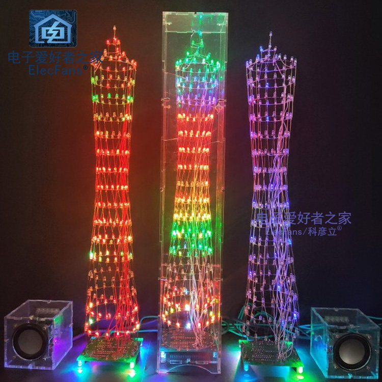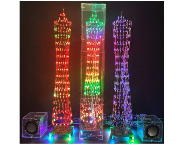 [本套件源于广州的广州塔形状而成的电子套件,由268只LED灯组成小蛮腰形状的三维空间。通电点亮之后呈现多姿多彩的效果,也可伴随着音乐节奏而跳跃呈现出频谱的效果,在夜晚或着较暗环境下观看效果较佳。七彩灯版本可以变化多种不同的颜色,效果比较绚丽多彩,本店也推荐大家购买此款,单色灯只有一种颜色,适合喜欢单种颜色并看起来纯净的发光效果。底板是一块电路板和元器件类散件组成,灯层的焊接配有模版,可以使焊接更容易便捷。焊接完层后可切换各种模式和完成调试。]
