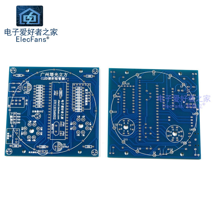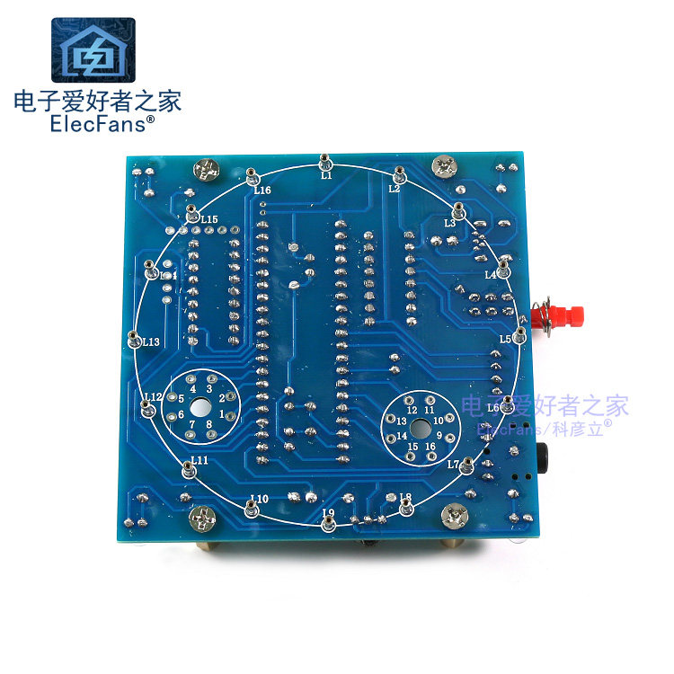 [LED灯折的是负极脚,也就是折的是短脚,不要折长脚,不要折长脚,不要折长脚,虽然资料文字教程和视频教程都有说折短脚,但是还是有客户折的是长脚,导致现象不正常(一般就是1-9层、16层亮,10-15层不亮,亮也是不正常的亮。正负极错了不一定都亮或者都不亮,程序控制的,不是简单的接错正负极就都不亮),所以自己折了长脚的就需要重新购买灯重新焊接了,灯是3mm七彩快闪的。也要注意元件焊接在哪一面,灯焊接在哪一面,看我们图片。不装外壳的话灯也可以焊接在元件的那一面。上一层灯与下一层灯的间距不宜过大,否则会导致焊接出来的成品较高,高于外壳的高度。塔身要旋转的话,建议焊接测试完所有灯亮再旋转,旋转后有灯不亮的再检查哪里因为旋转而脱焊了。]