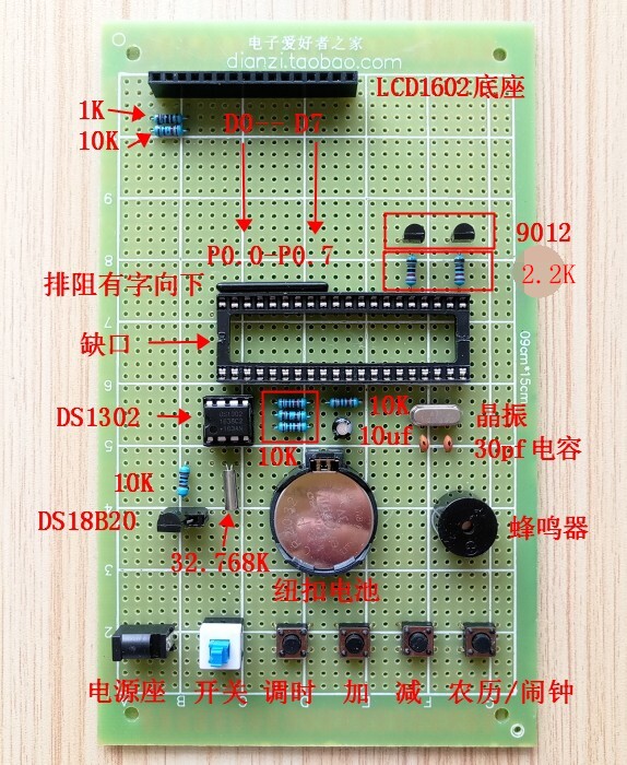 Использование LCD1602 показывает, что содержание может отображаться с текущим календарем, лунным календарем, неделей, времени, времени и температуры окружающей среды. Вы также можете настроить будильник, который имеет функцию потери мощности.