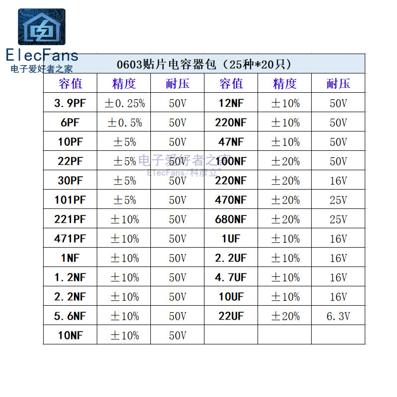 0603 Пакет патч-конденсатор 3,9PF-100NF/104/0,1UF-22UF 25 типов по 25 значений каждые 20 каждая
