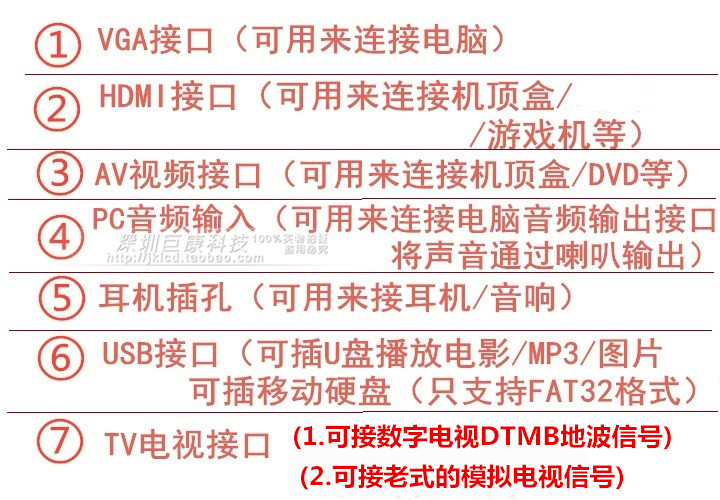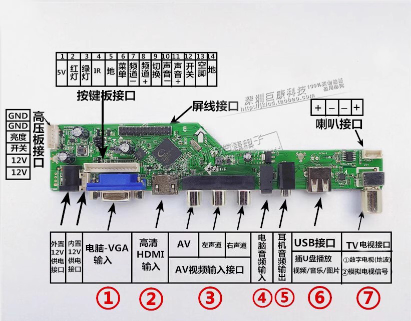 На плате есть интерфейсы VGA, чтобы подключить компьютер,HDMI High -Definition Interface может подключиться к комплекту -top -коробке, трехгласовый интерфейс Lotus AV может быть подключен к верхней части Box/DVD, USB -интерфейс может воспроизводить U -диск, телевизионный интерфейс может подключить антенну заземления DTMB, чтобы посмотреть телевизор