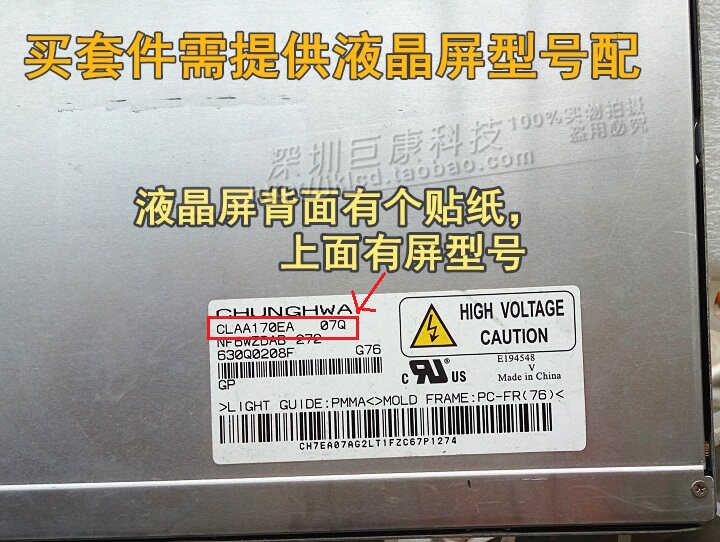 Примечание. При покупке телевизионного комплекта, пожалуйста, свяжитесь с обслуживанием клиентов, чтобы объяснить свой ЖК -дисплейМодель экрана, если вы не можете ясно идентифицировать, вы можете взять ЖК -экранДайте нам полную картину на спине, и мы подтвердим спецификации модели.
