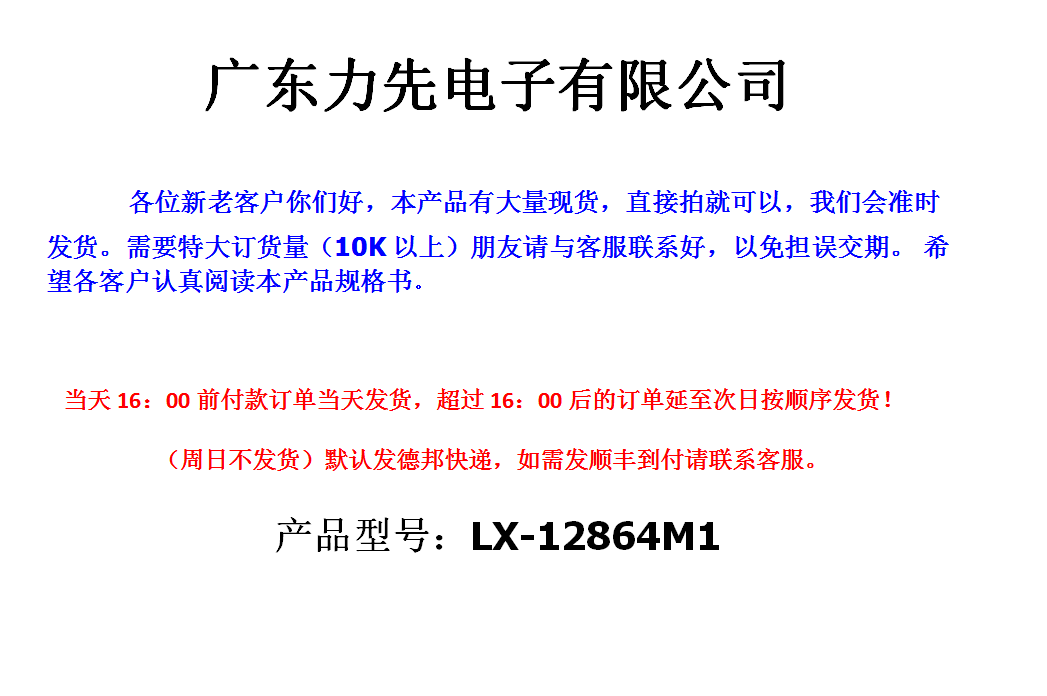 ЖК-модуль LX-12864M1, производимый нашей компанией, небольшой, легкий, простой в использовании и имеет четкий дисплей. Он широко используется в различных панелях связи человек-компьютер.Эта модель может отображать 128 столбцов * 64 строки.