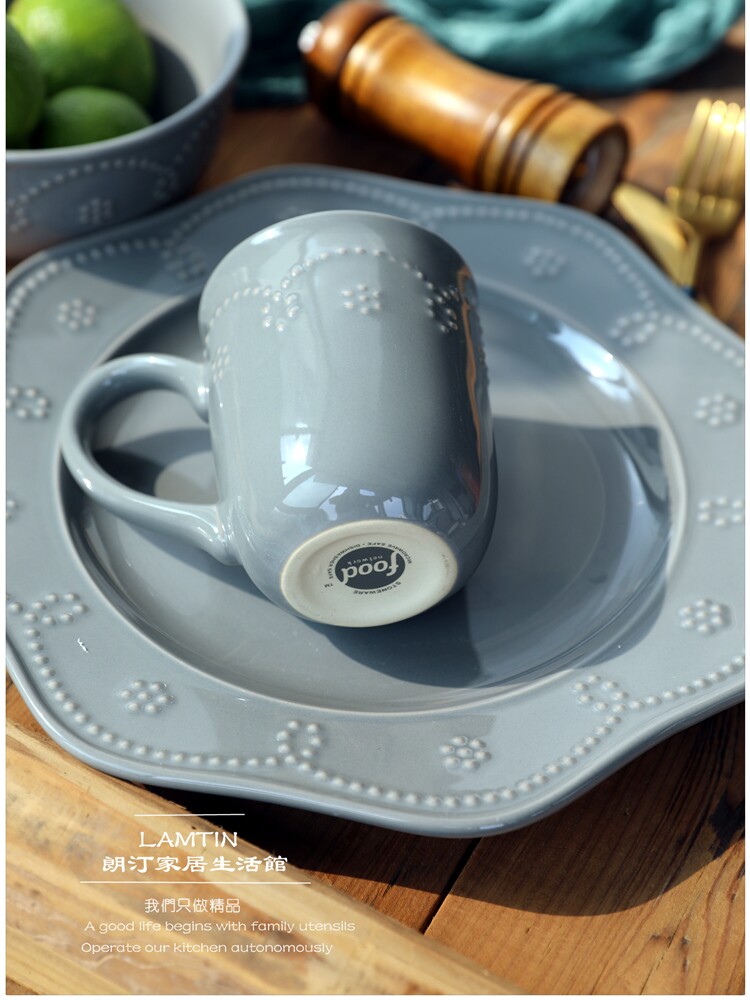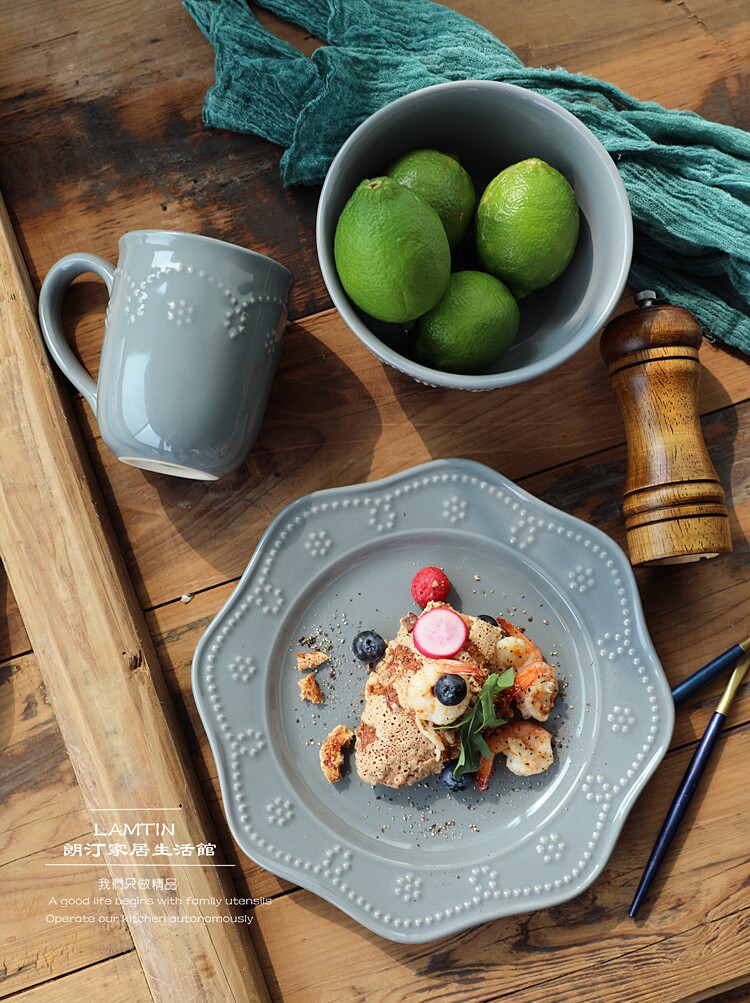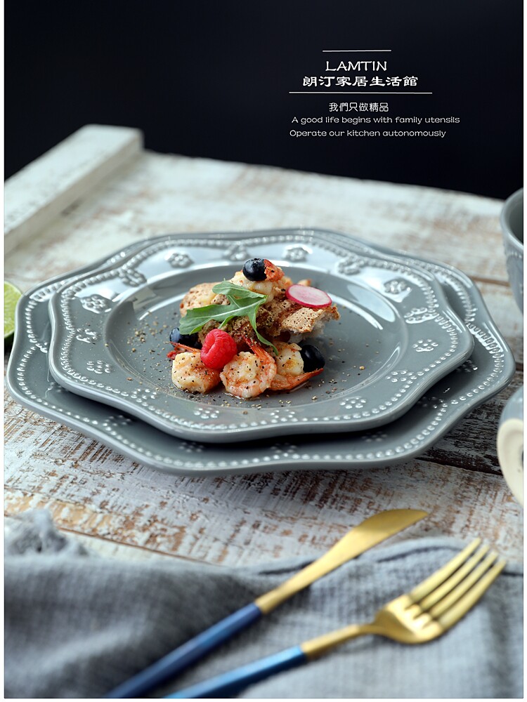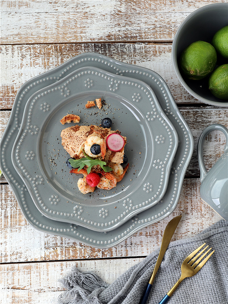 Прозрачно!Туманно -голубое серое северное творческое творческое керамическое посуду рельефная сеть бусинки Кружевая западная блюда блюдо из пасты салат салат
