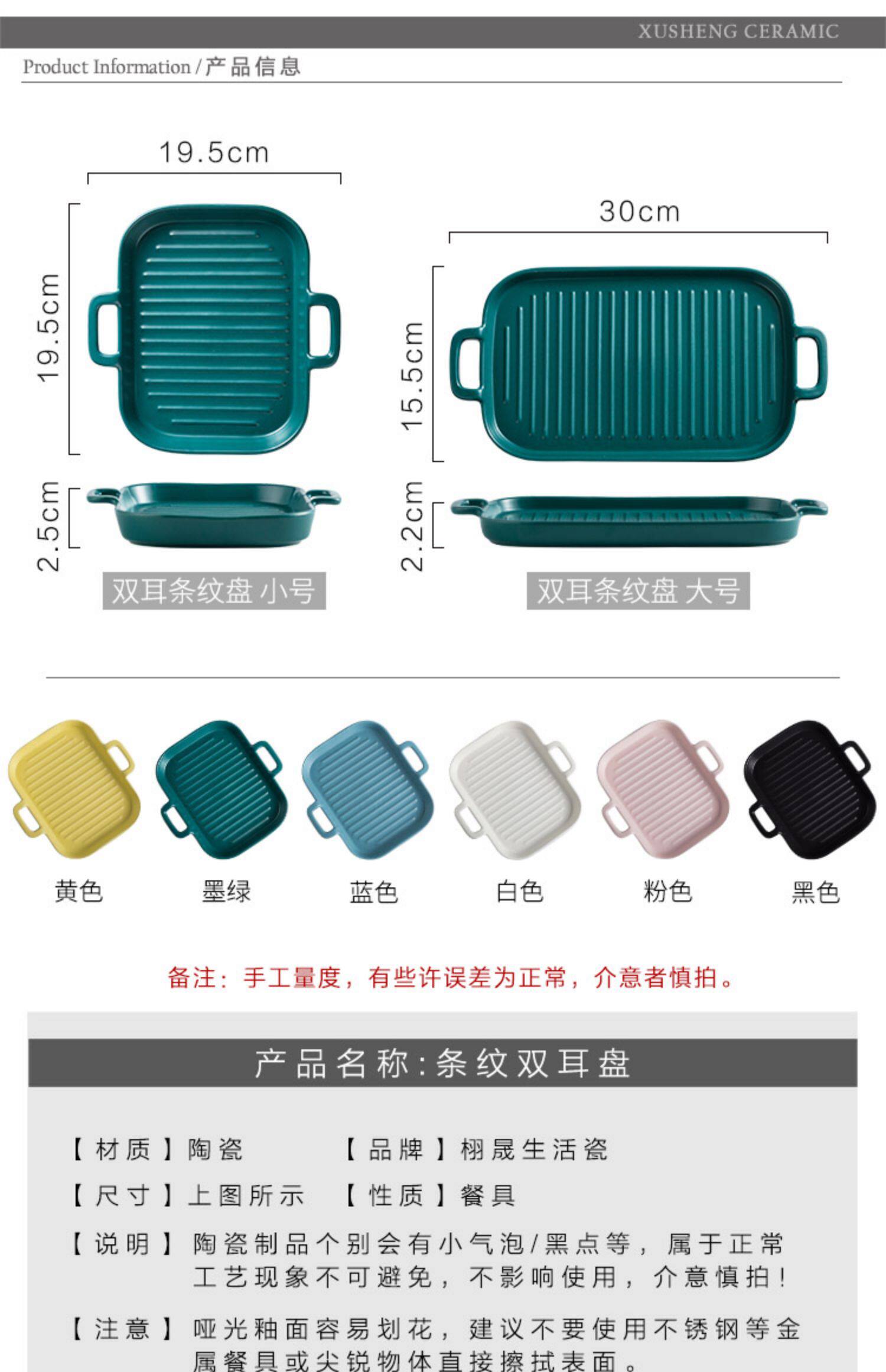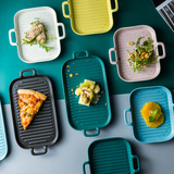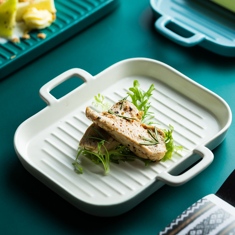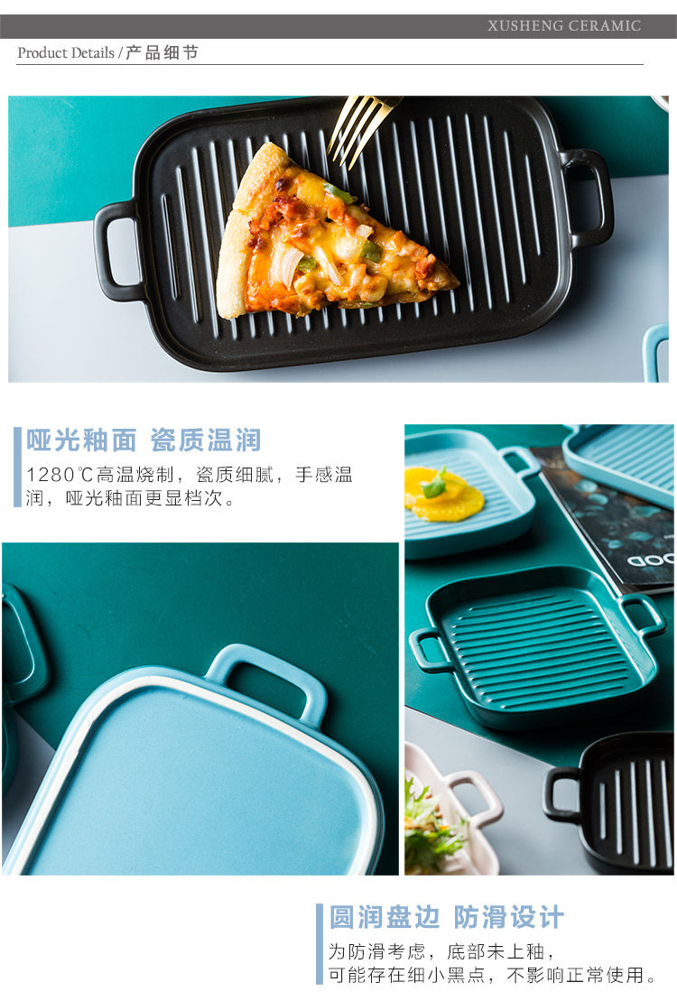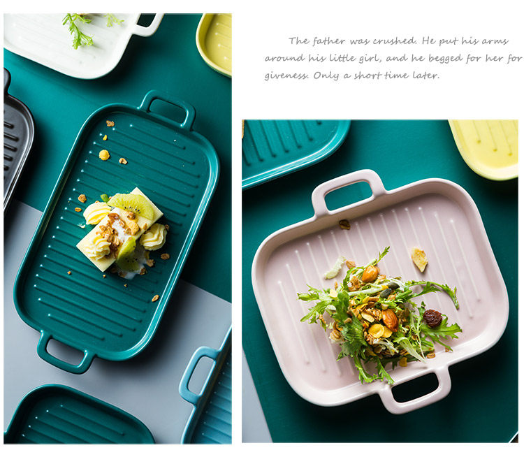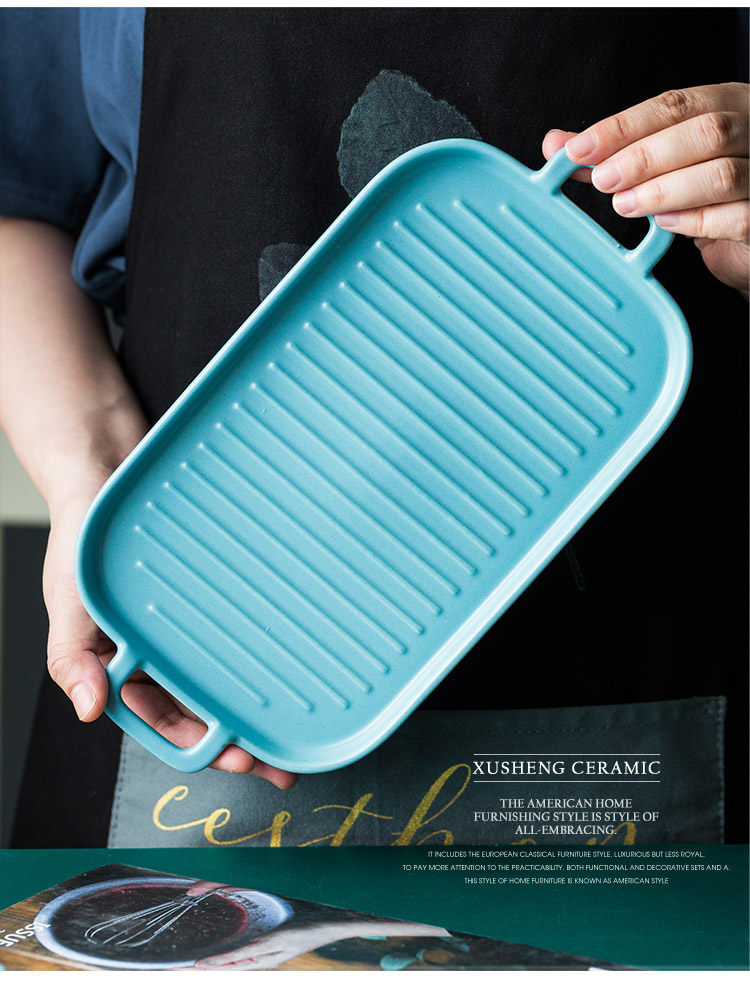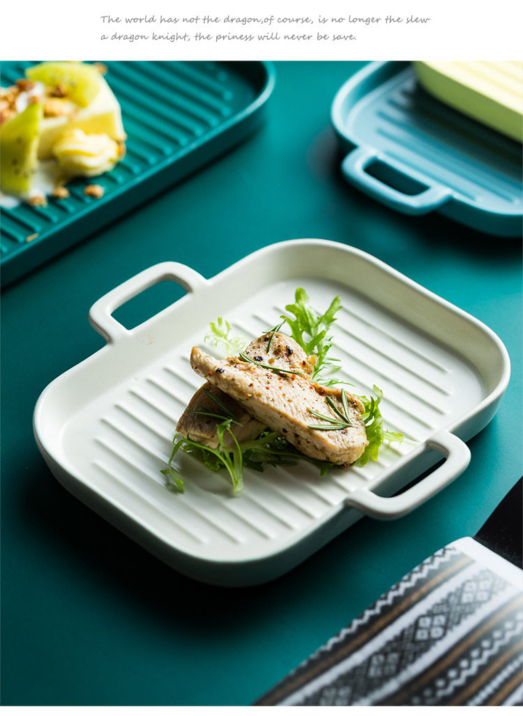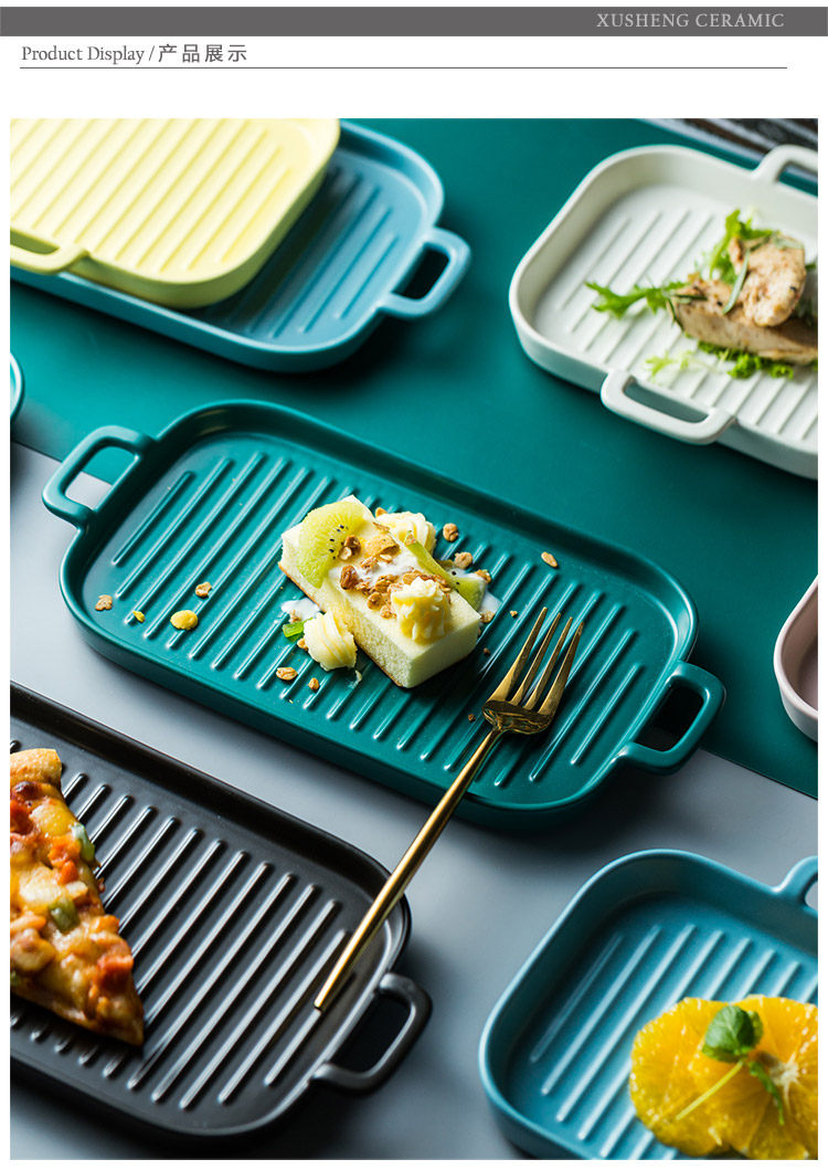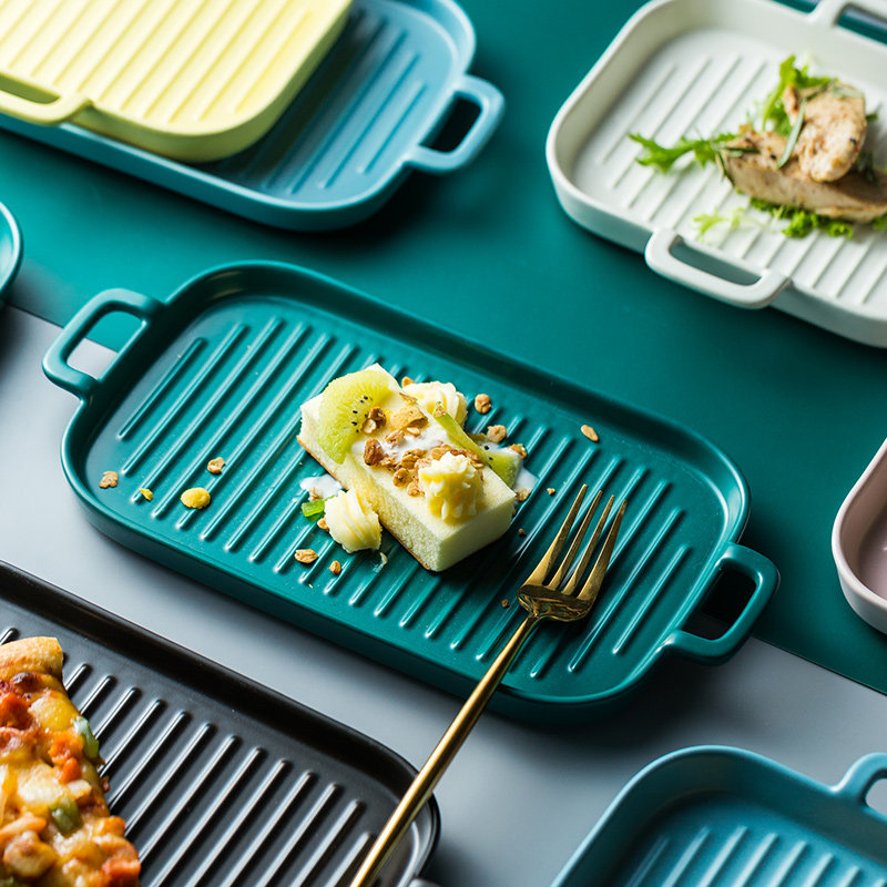 [北欧陶瓷双耳盘子托盘 家用早餐盘西餐盘餐具 烘焙烤盘长方形盘子]