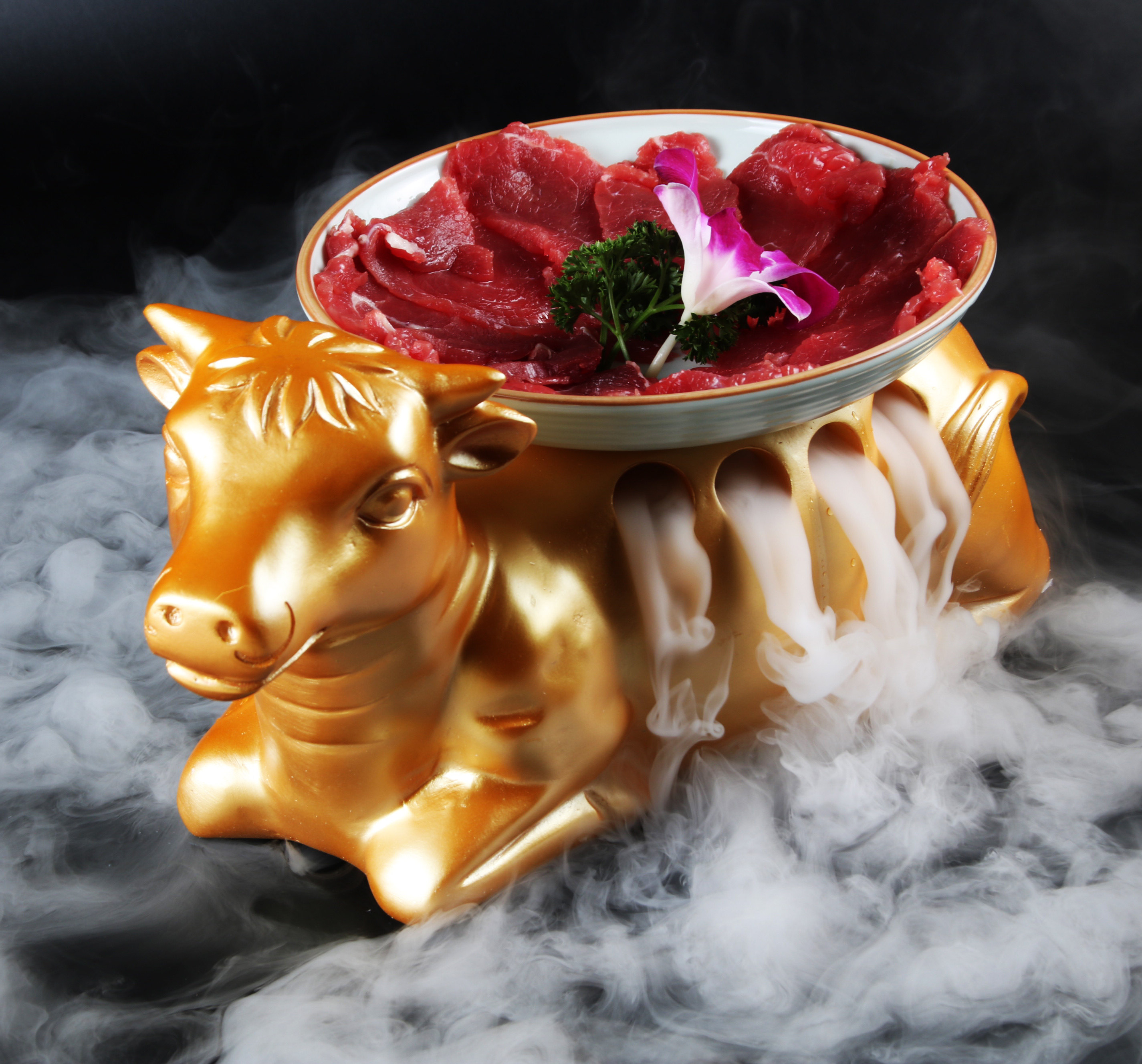 Приготовление дыма маленькая жареная желтая говяжьем посуда с сетью красного сухого ледяного дыма.
