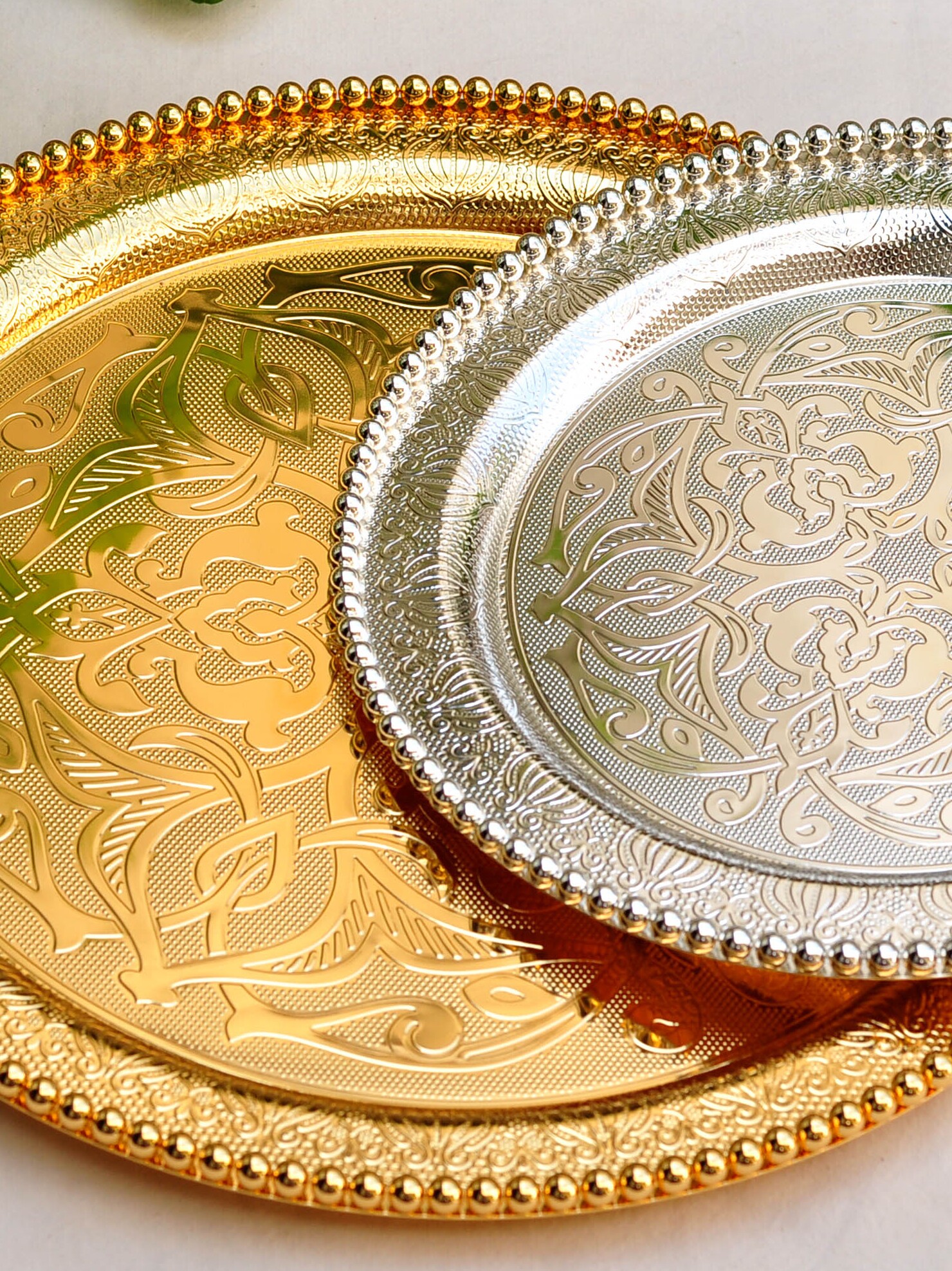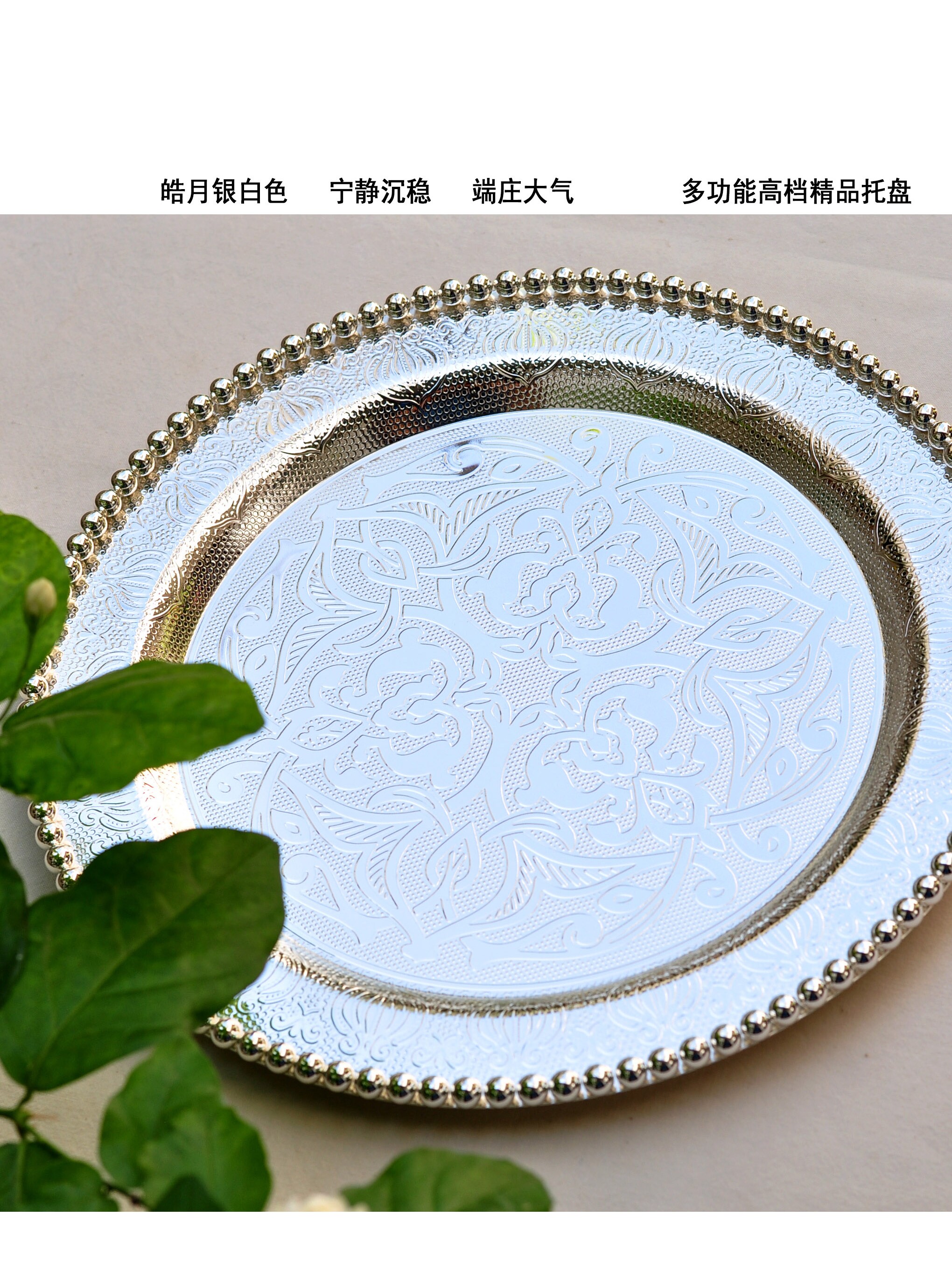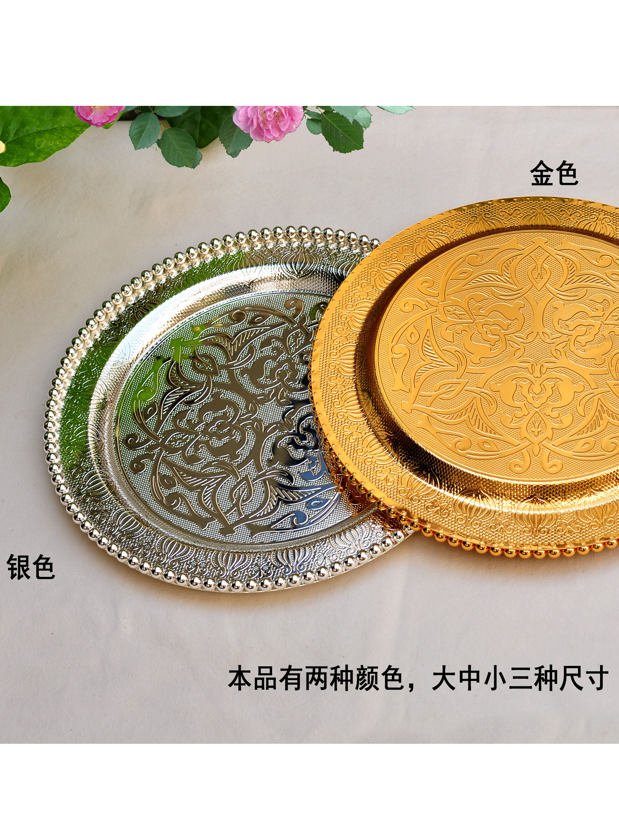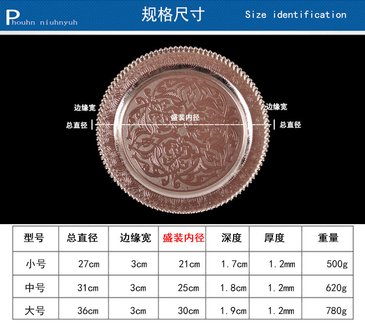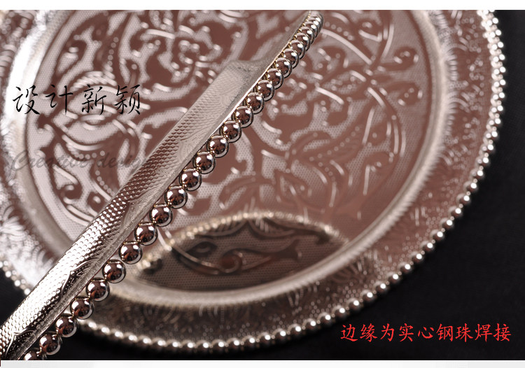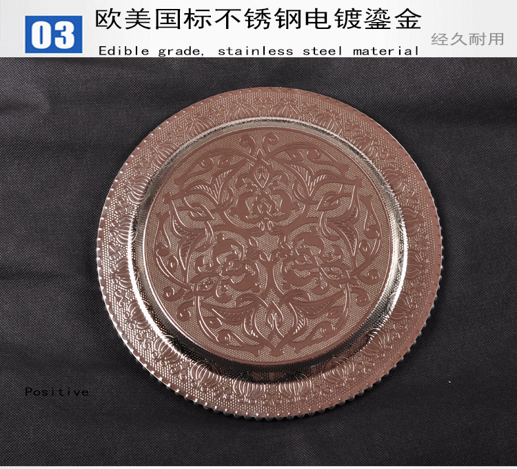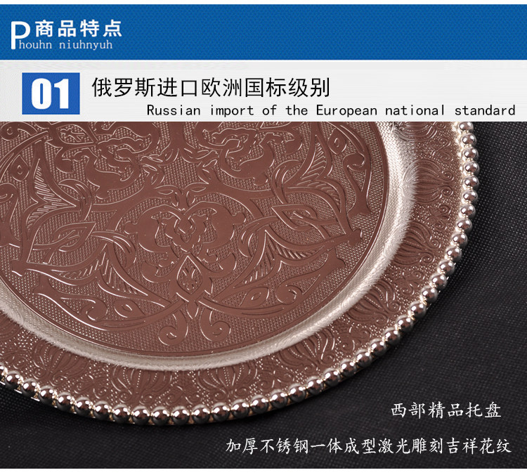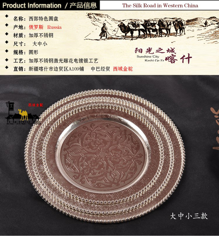 Продвижение русской элитной высококачественной нержавеющей стали с гальваническим покрытием из серебра, круглой тарелки, пиццы, хлеба, булочки наан, мяса, этнического ресторана Синьцзяна, характерного стиля, посуда, тарелка в стиле ретро, закуска, бытовая тарелка, винный набор, кубок, многофункциональный поднос