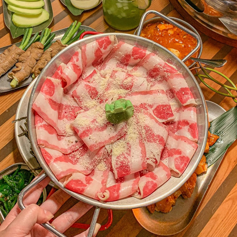 Густая плоская сухой кастрюля с жареной курицей, двойная тарелка, паста в стиле корейского стиля, морепродукция рисоварки, тарелка раков с ручкой