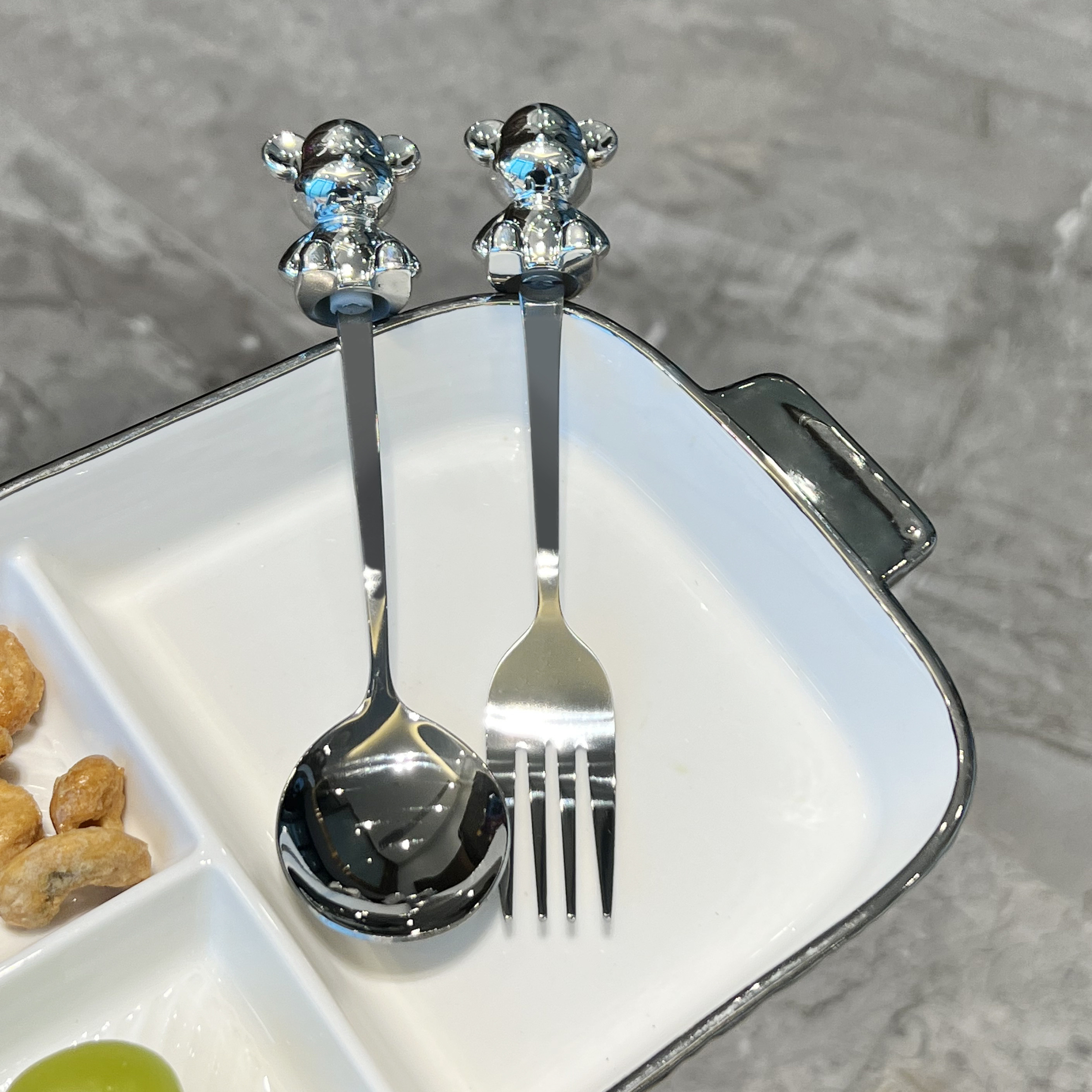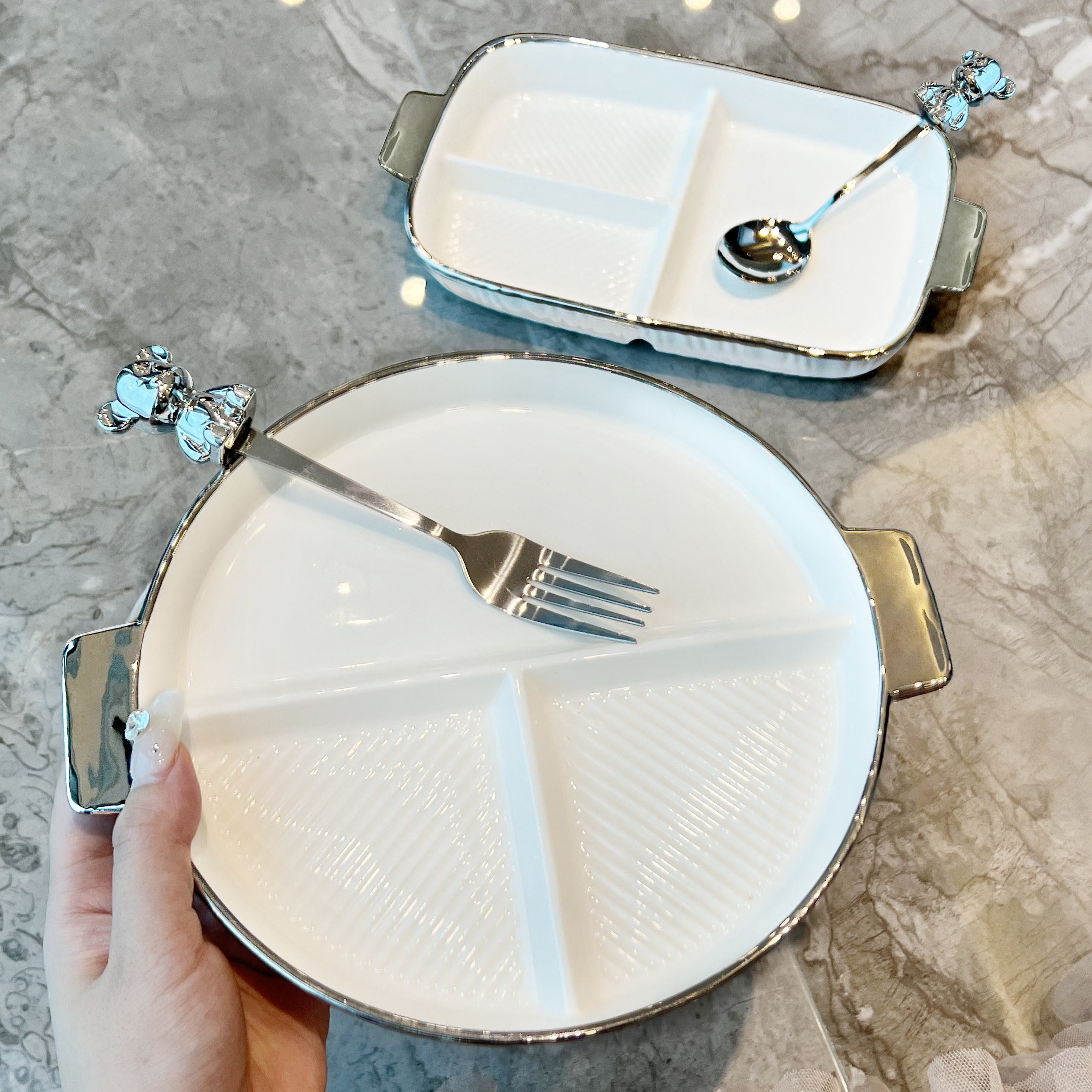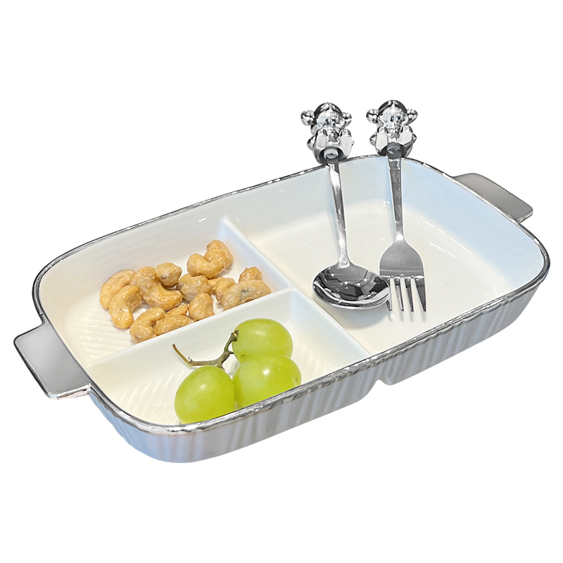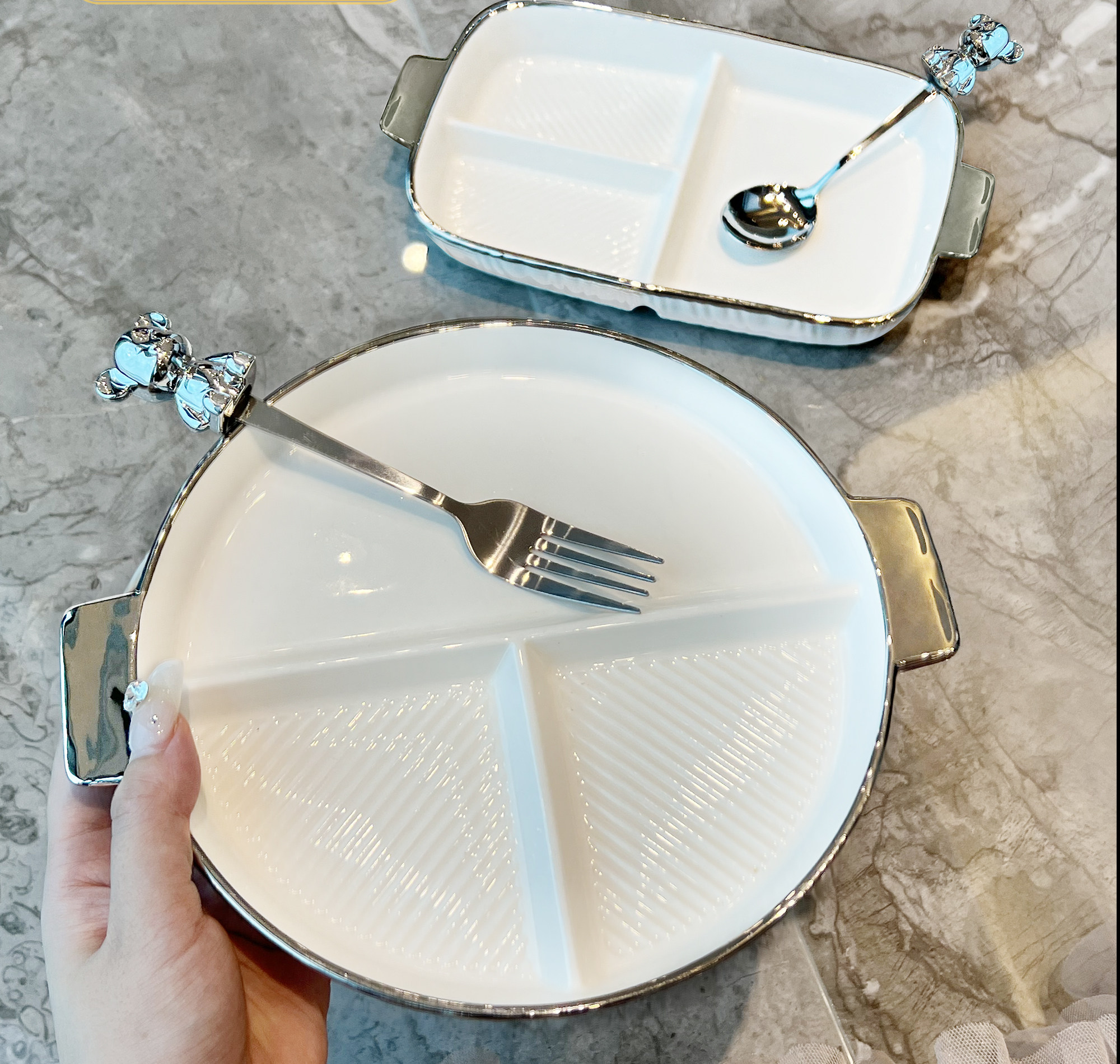- Круглая разделенная тарелка + медвежья вилка (серебро)