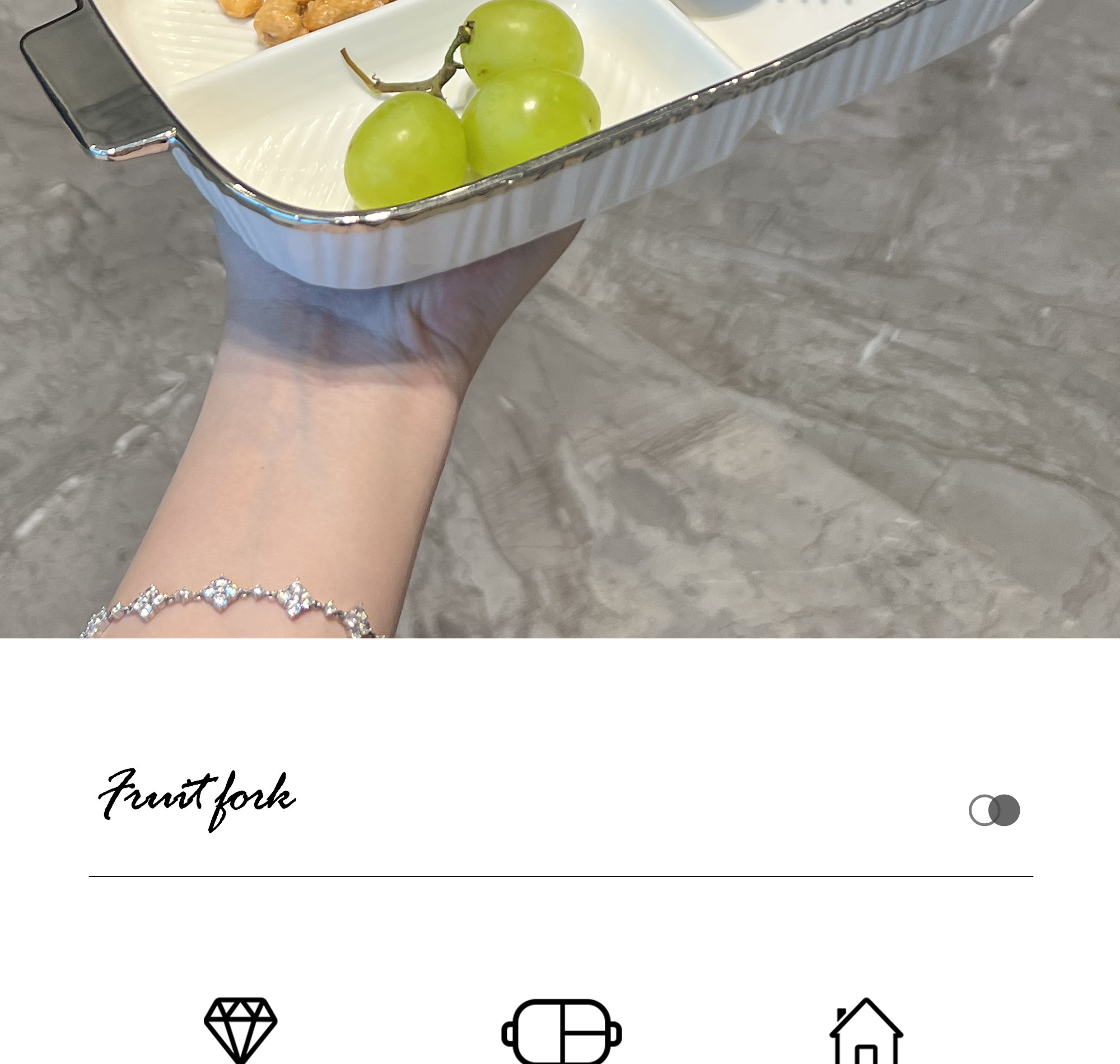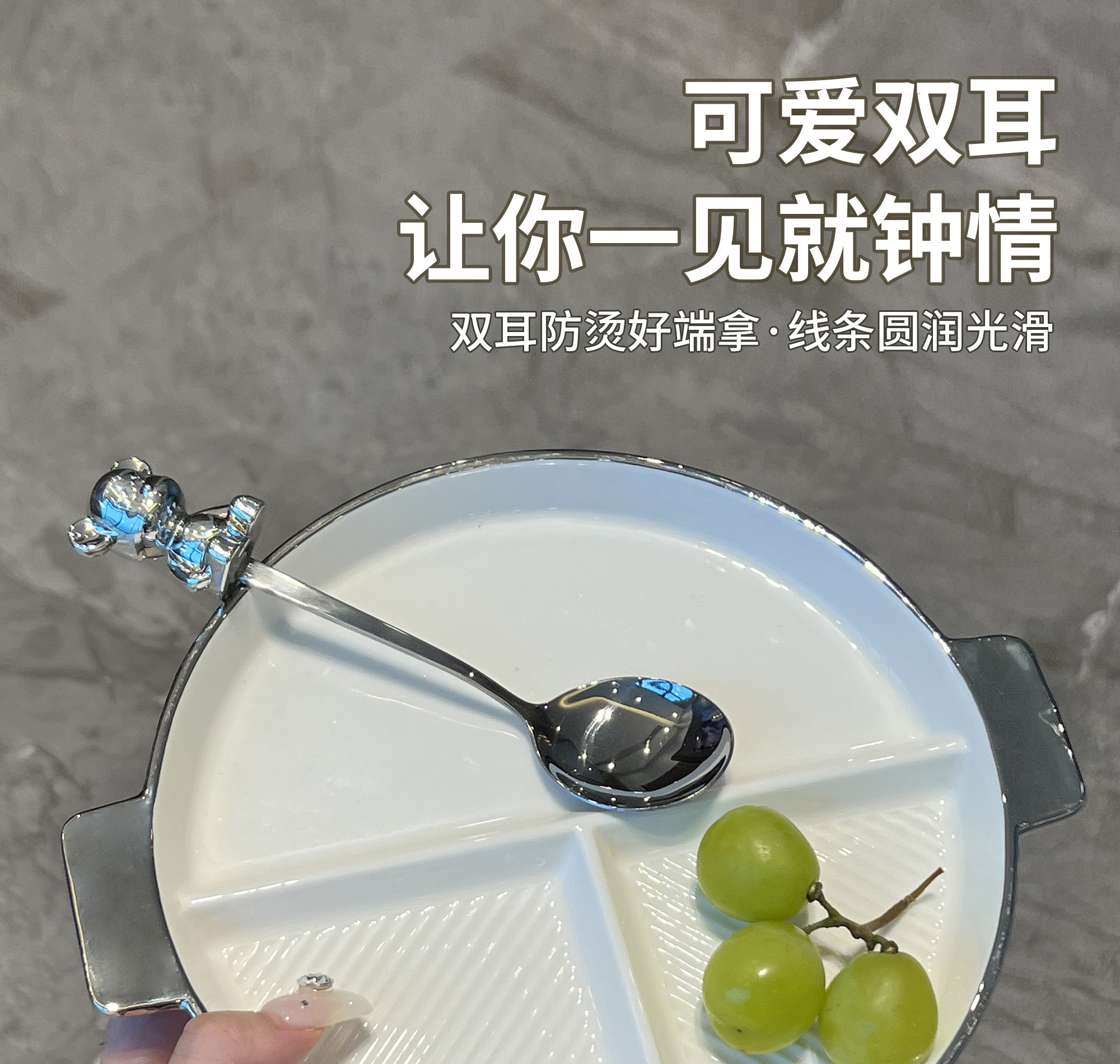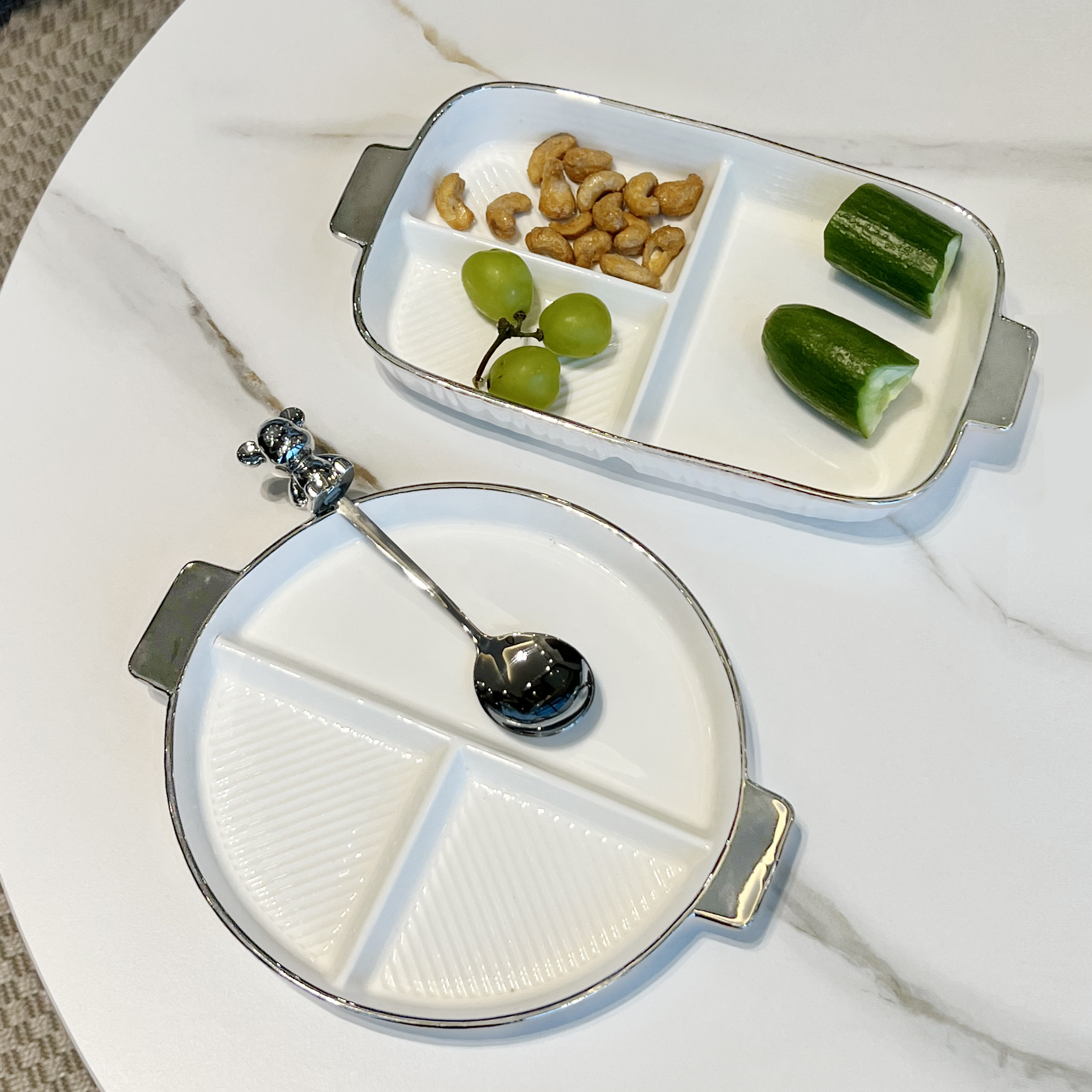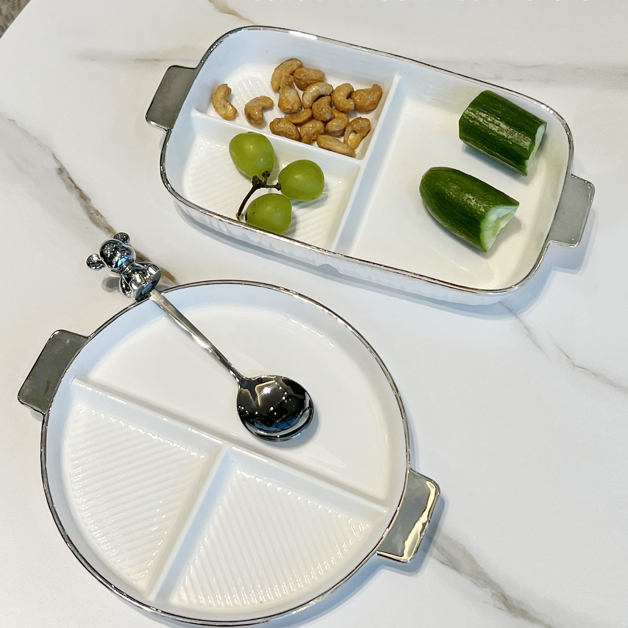 - Круглая разделенная тарелка + медвежья вилка (серебро)