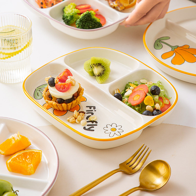 211 Жирная тарелка для еды, разделенная на фри-тарелку с тремя сетевыми керамическими тарелками для завтрака, дети, разделенные на пластину фри-тарелки