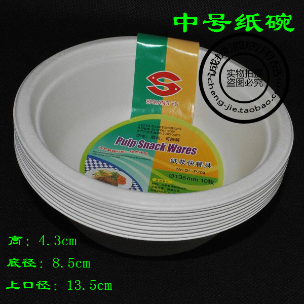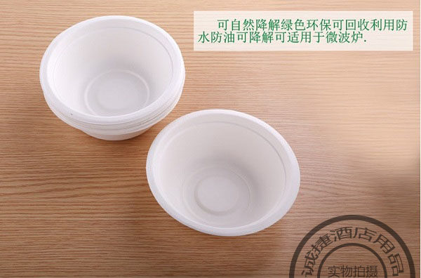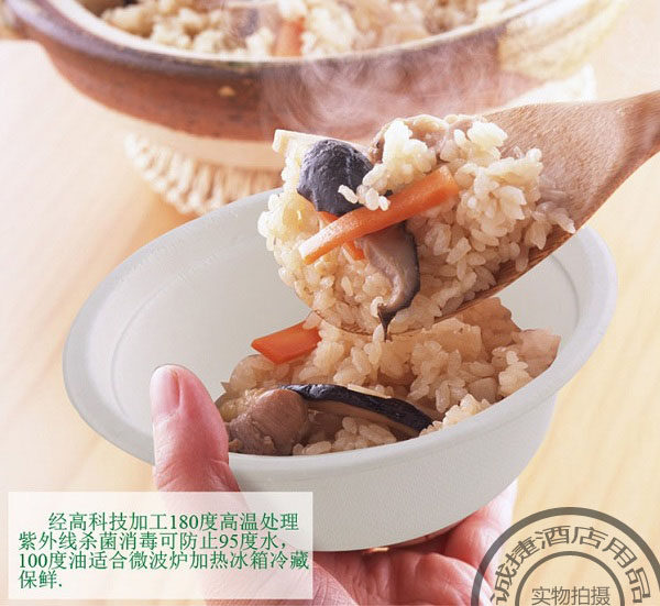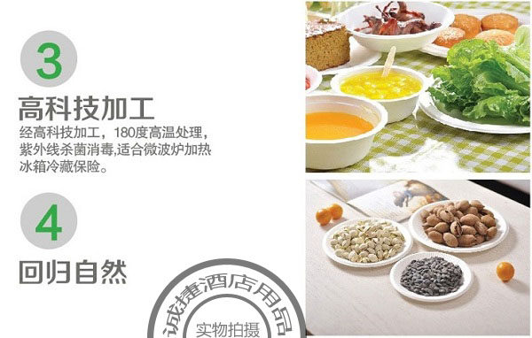Рыбы целлюлозы Экологически чистая посуда используют растительные волокна, такие как сахарный тростник, тростники и говяжья трава в качестве мякоти (принадлежащей к отходам) в течение одного года. После 180 градусов высокотемпературной обработки, ультрафиолетовая стерилизация дезинфекция и применение химических добавок пищевых веществ Следующие характеристики: