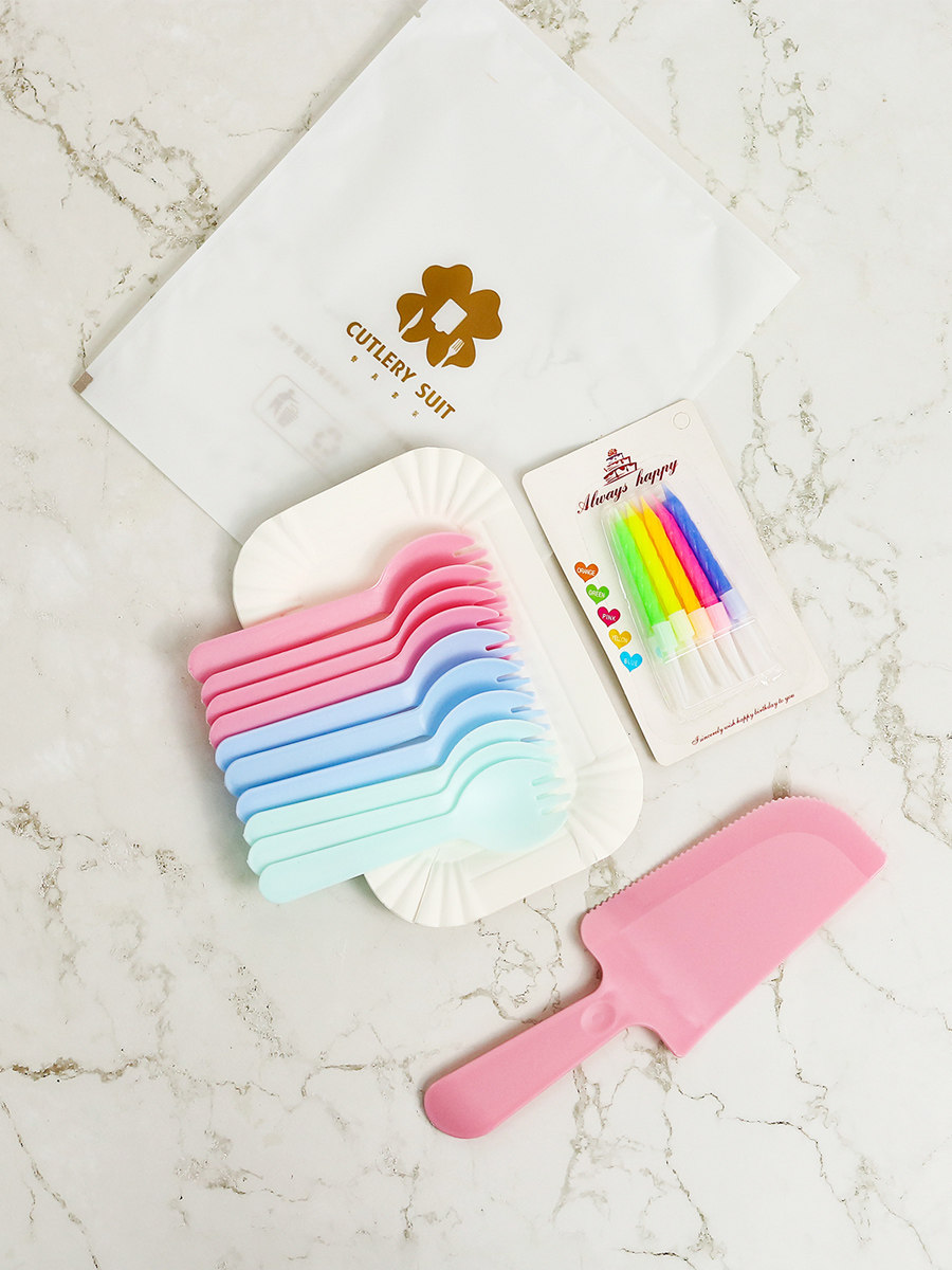Четырехлетние магазины в магазинах более 20 цветов цветовой посуды на столовую посуду для торта на день рождения и вилка, набор продуктов -общить одноразовый нож и вилка бумага