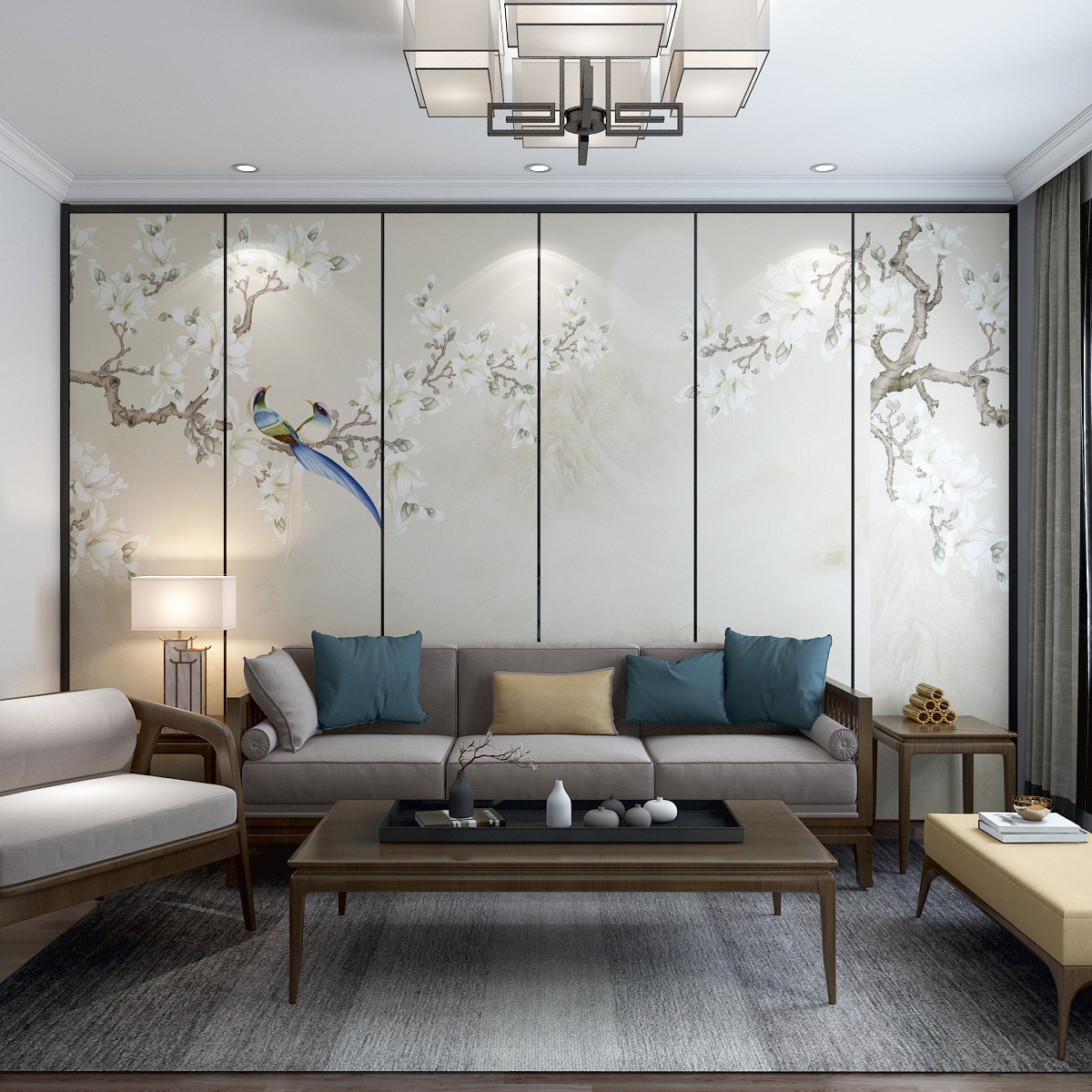 Новая китайская роскошная гостиная диван, цветы, птицы, ландшафтные твердые мешки, телевизионная фоновая стена жесткая установка металлическая полоса