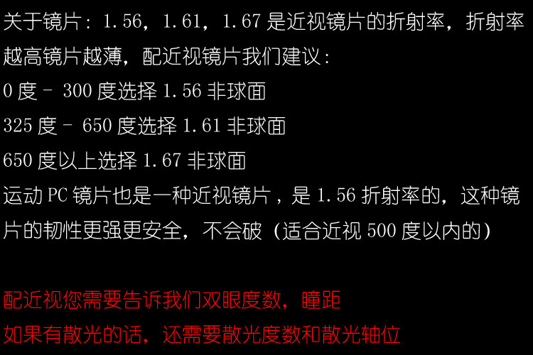 | Объектив: | С 1,56 взрывами -наделенные не -мячи, С 1,61 не -кферической линзой, С 1,67 не -пешевыми линзами, С 1.56 не -кферическая линза, Одиночная рама |
