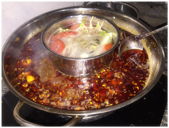 На рисунке ниже - горячая точка владельца магазина, используя вареного горячего кастрюля и горячего горшка красного масла, суповую воду и вареный горячий горшок вместе.Цвет красный и яркий, а пряные и конопляные вкусы очень хорошие.Аромат также заполнен.
