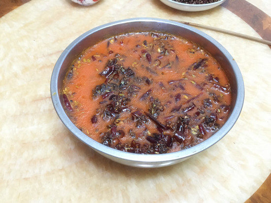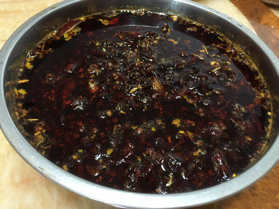 На рисунке ниже - красное масло горячего горшка, сделанное владельцем. Поскольку оно было сделано, когда оно было сделано, оно не было затвердевано.Поставив одну ночь, красное масло затвердеет.