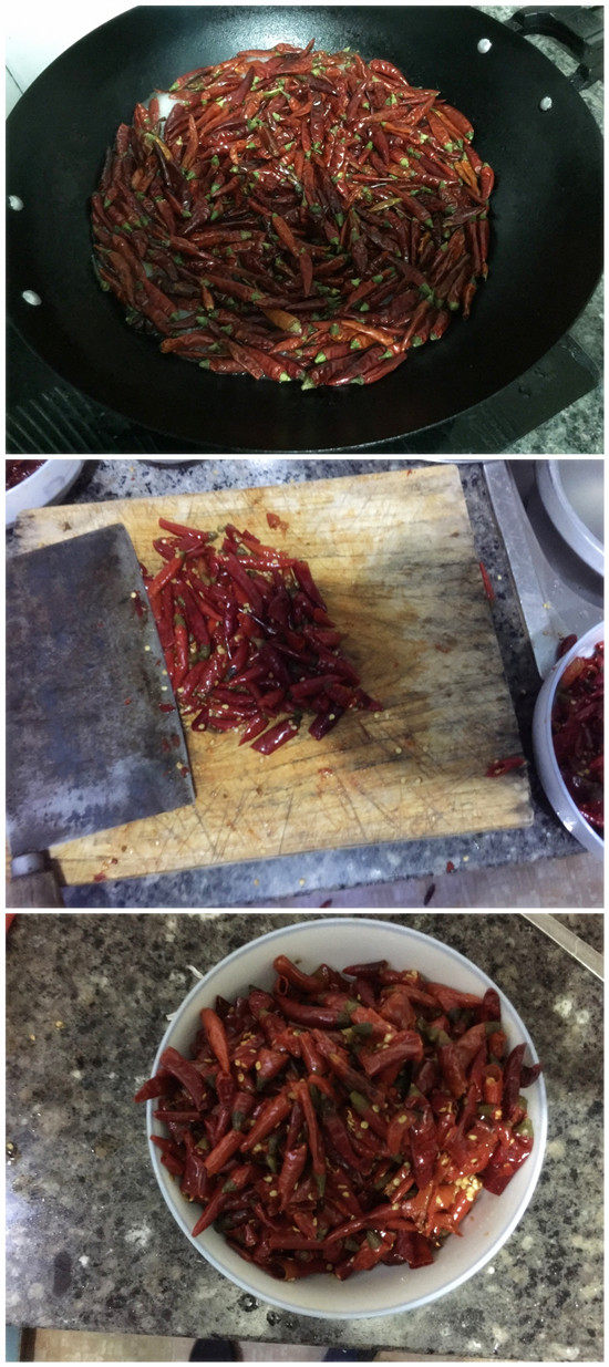 Поместите сушеный перец чили в кастрюлю с кипящей водой и варите около 5 минут. Удалите его ножом и нарежьте его на кусочки, то есть для образования перца равиоли.(Поскольку владелец слишком поздно, он не очень фрагментирован, поэтому кусочки чили относительно толстые, вы можете обрезать его подробно, когда вы это сделаете)