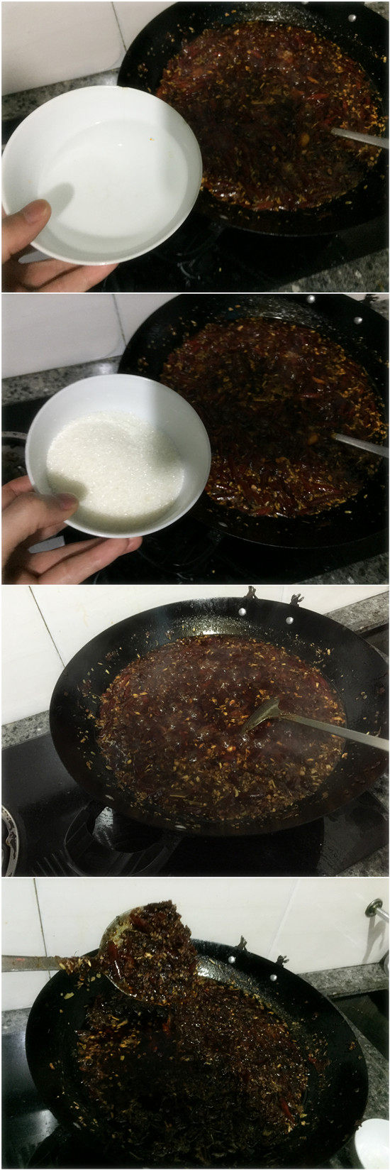 5. Затем добавьте сахар, ликер и медленно варят, пока вода из ликера не будет полностью испарилась с низким теплым огнем.(Напоминание: не забудьте сделать низкий огонь, не кипятите. Не будьте жадным, чтобы сэкономить время и варить огонь. Целью добавления сахара является нейтрализовать острый вкус перца. Запомнив свое горло, вы не едите сладость, не волнуйтесь. Роль добавления ликера, конечно, в том, чтобы удалить рыб.