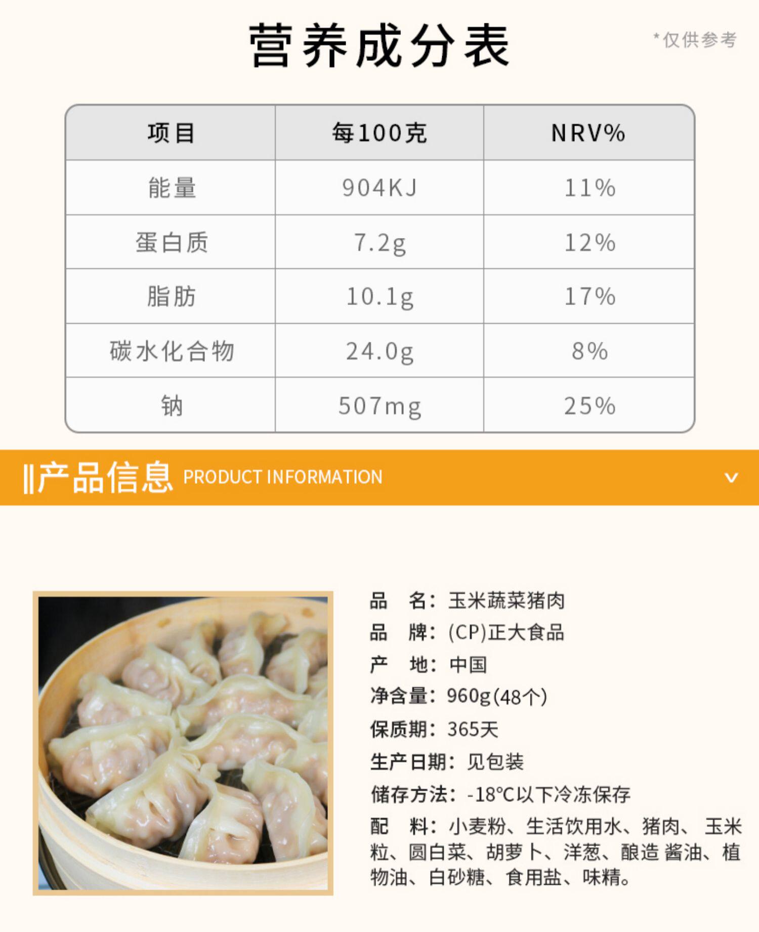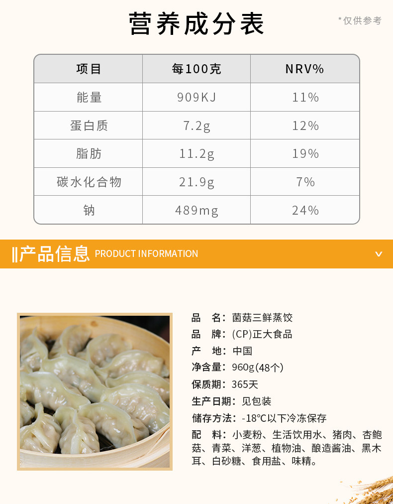 CP Zhengda Pareed Prymplings 960 г гриб Три свежих кукурузных овощей, жареные пельмени на свиной завтраке, микроволновое микроволновое отопление и приготовление пищи