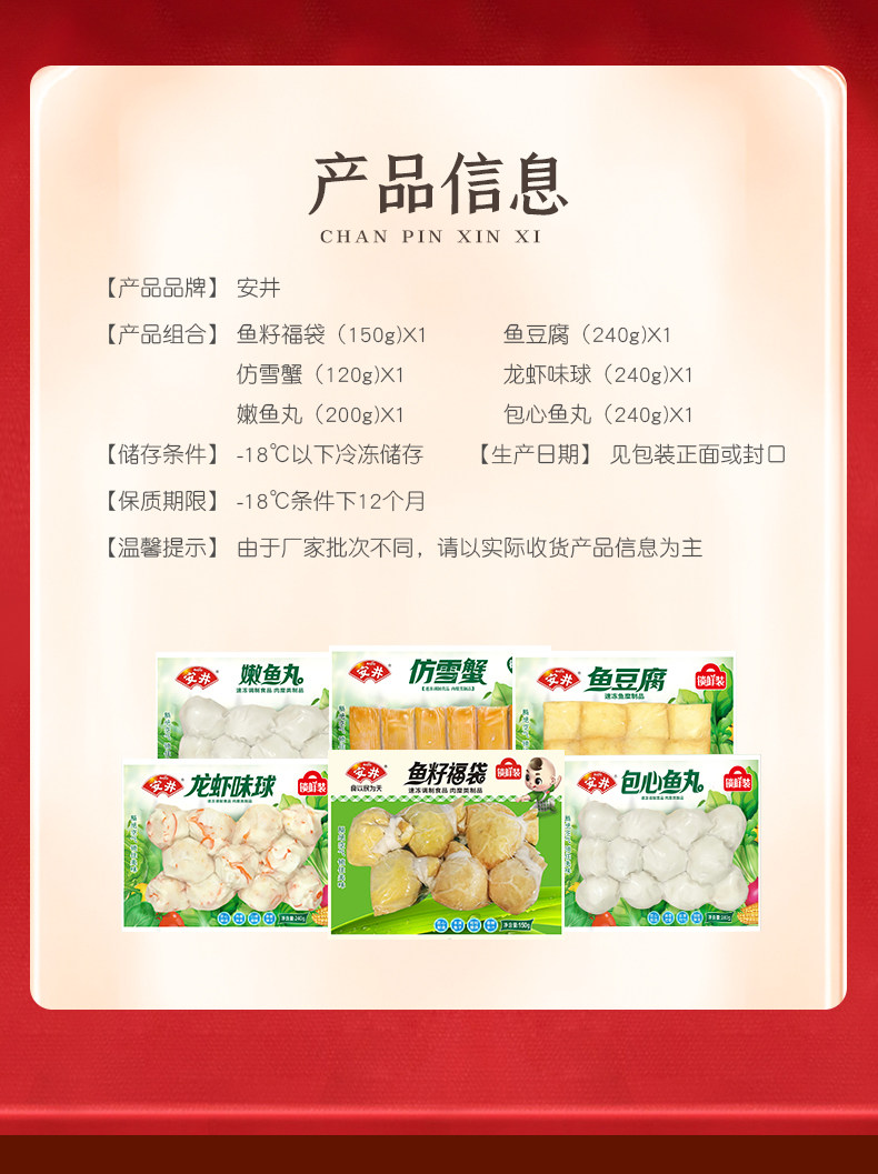 | Избыточный вес: | Сумка благословения рыбы+рыба Тофу+омар ароматизированное мяч+сердце рыба+нежный шарик рыбы+имитация снега краба |
