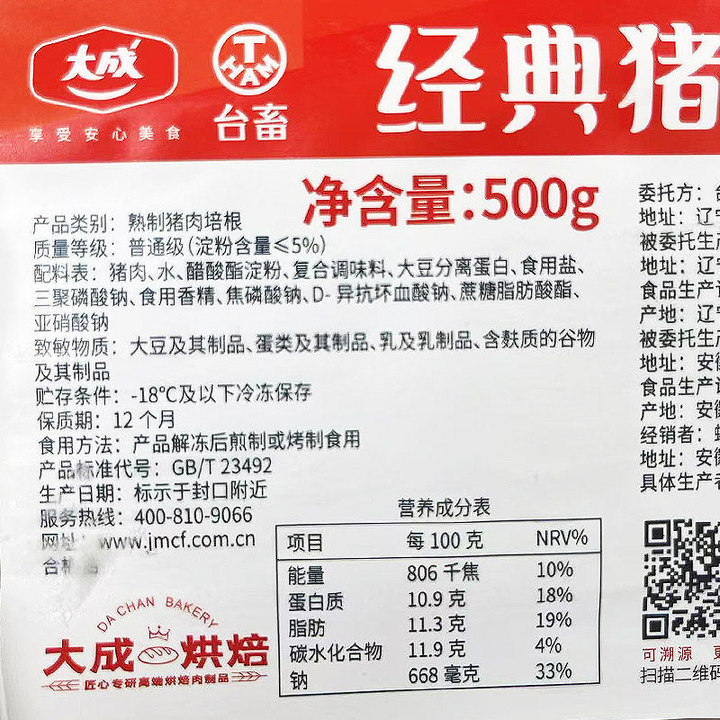 Dacheng Pork Bacon 500G*20 Пакеты, завтрак, домашний бутерброд, барбекю, пицца, пекарня, обед, коммерческий бекон