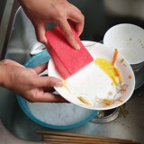 5 кусочков посуды, вытрите кухню, поглощайте воду, очистите посуду, смахивайте горшок, смахивайте миску, миску кусочков губки, протрите