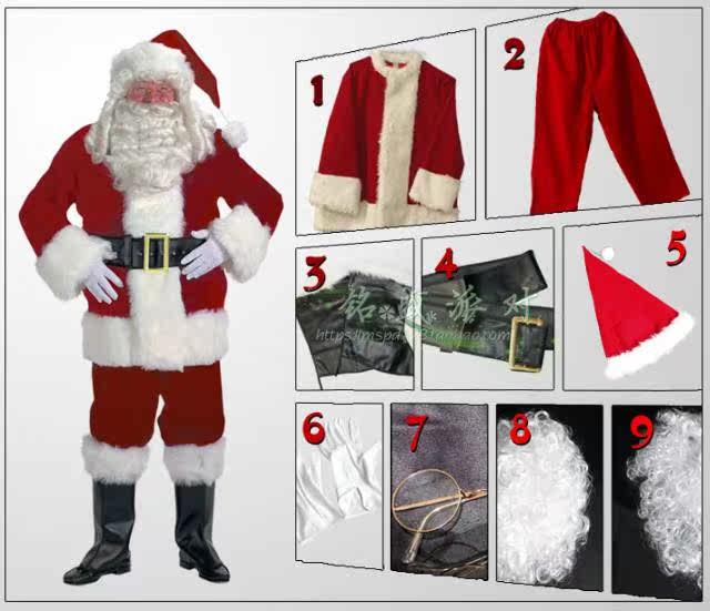 Спецификация продаж | Рождественские костюмы включают в себя: шляпу, парики бородатых, брюки для ремня, белые перчатки |