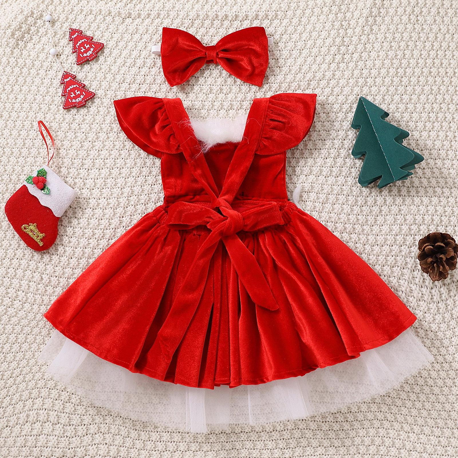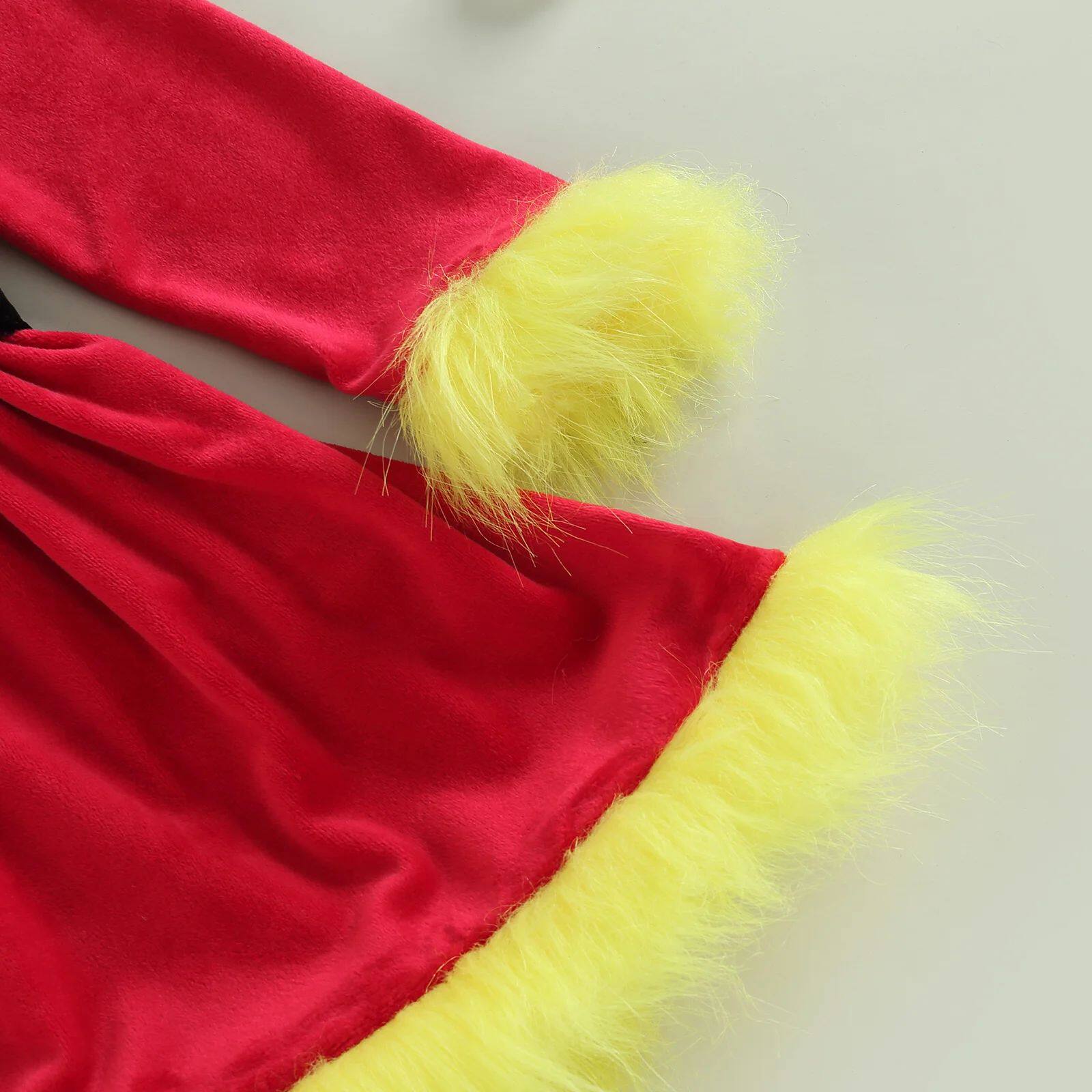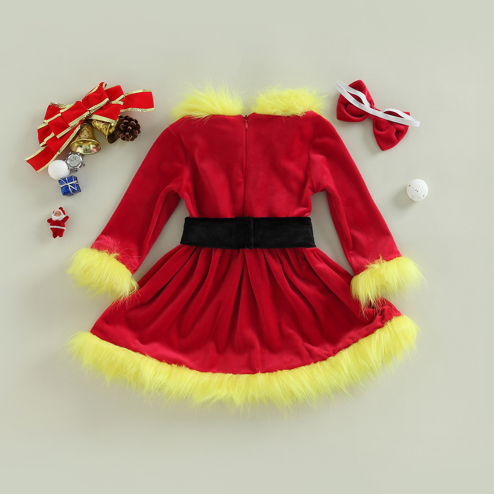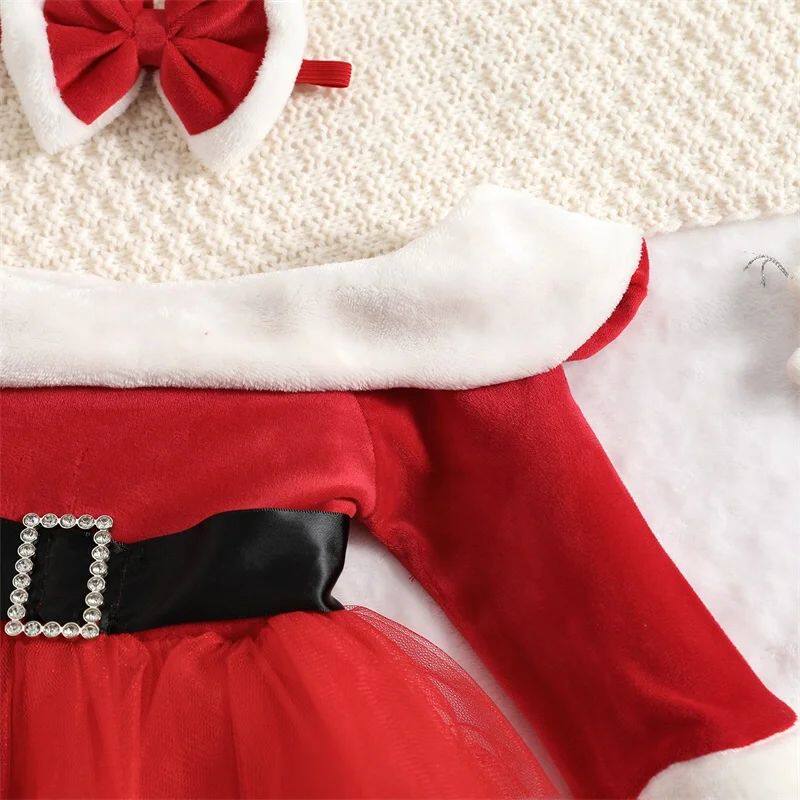 Комплект рождественской одежды для маленьких девочек, лоскутное платье трапециевидной формы с длинными рукавами и открытыми плечами из искусственного меха с поясом + повязка на голову с бантом