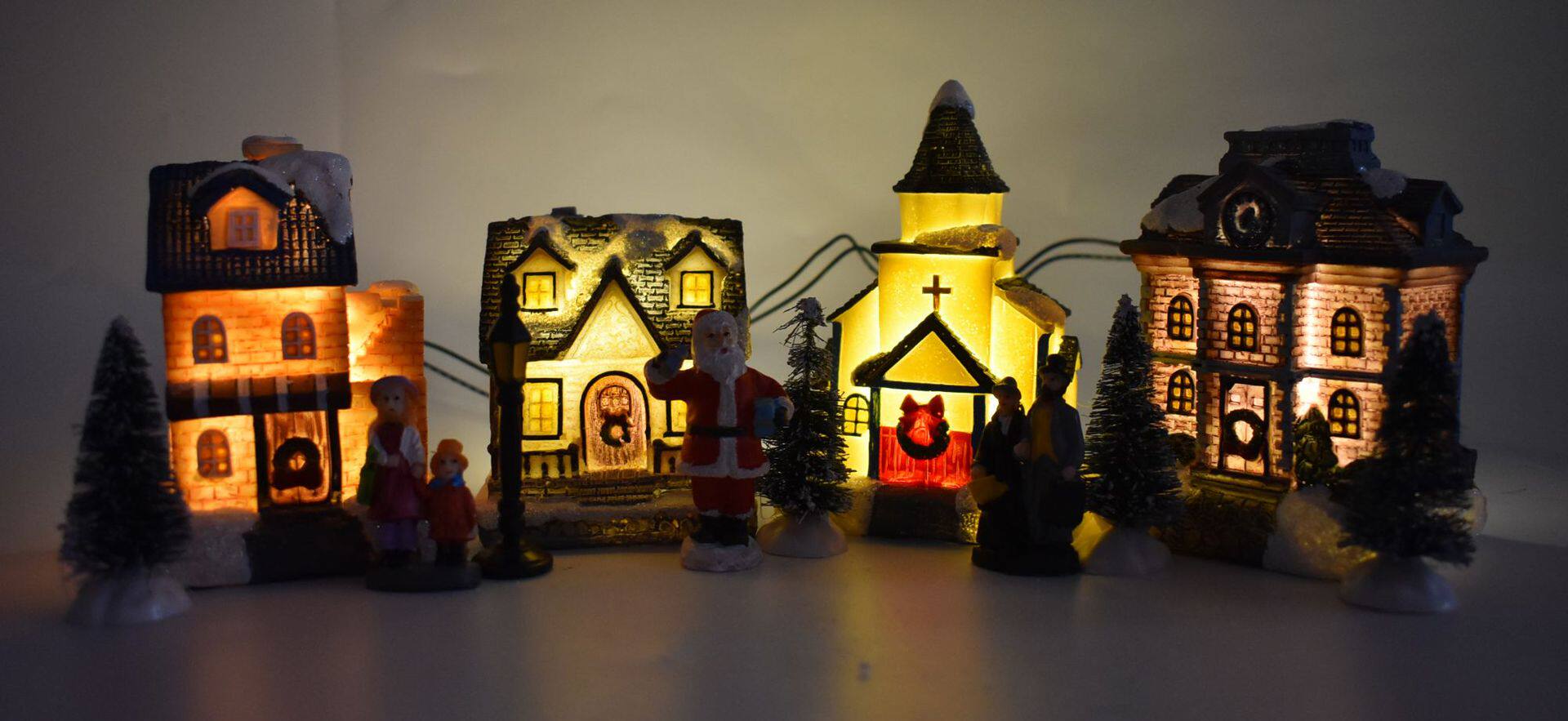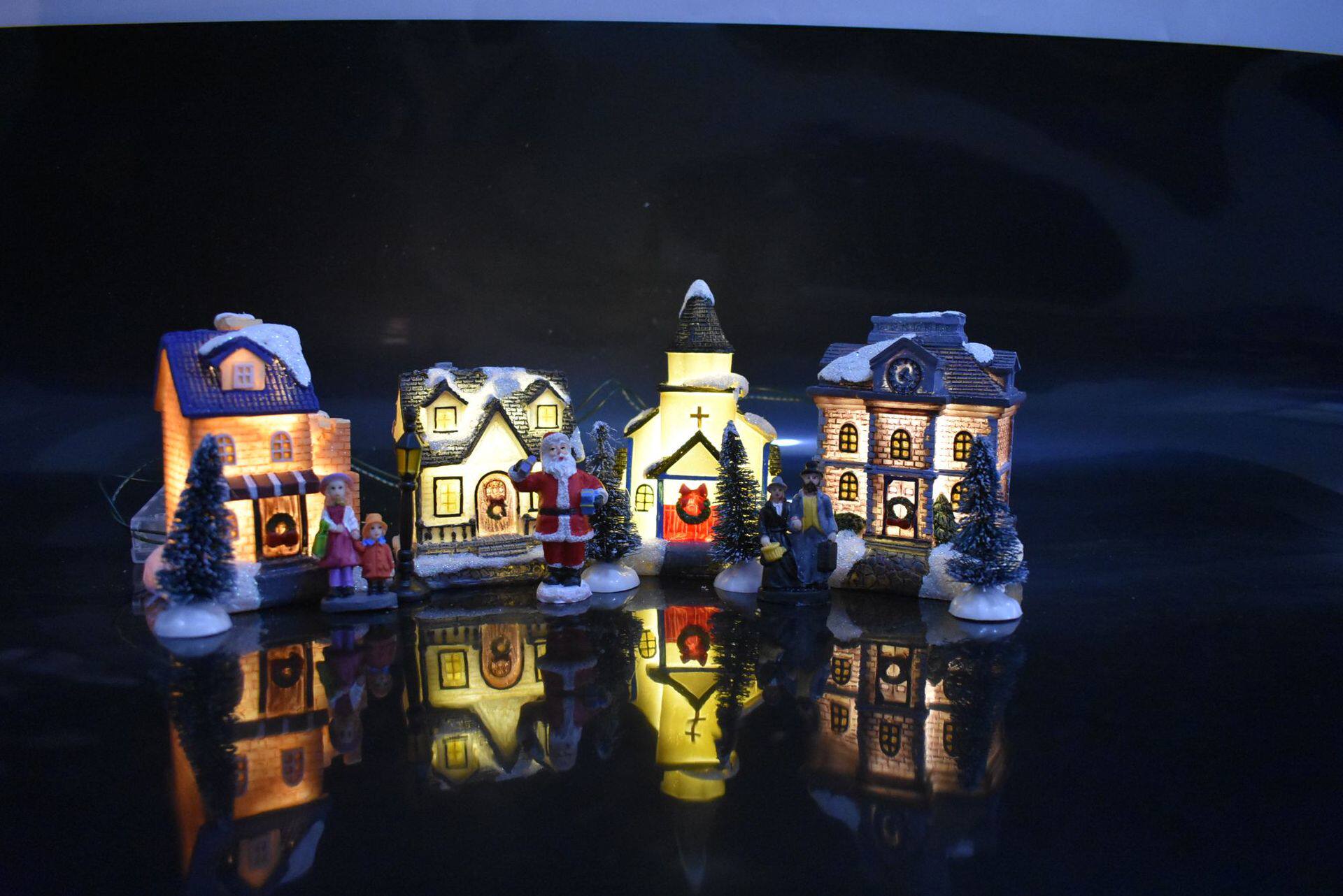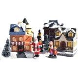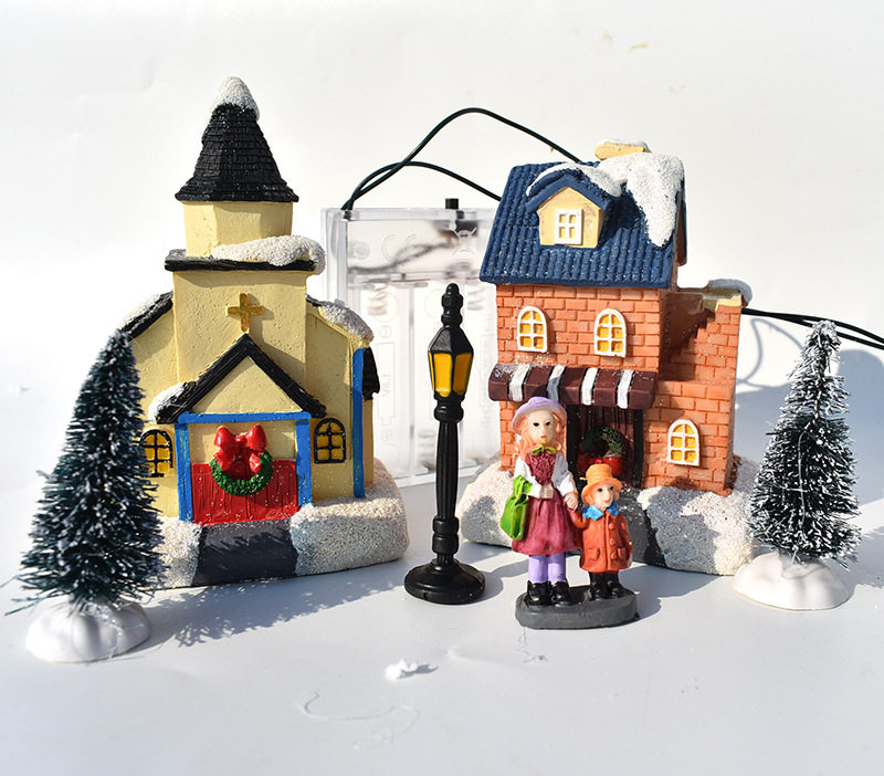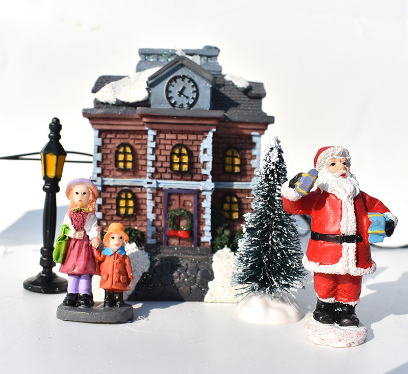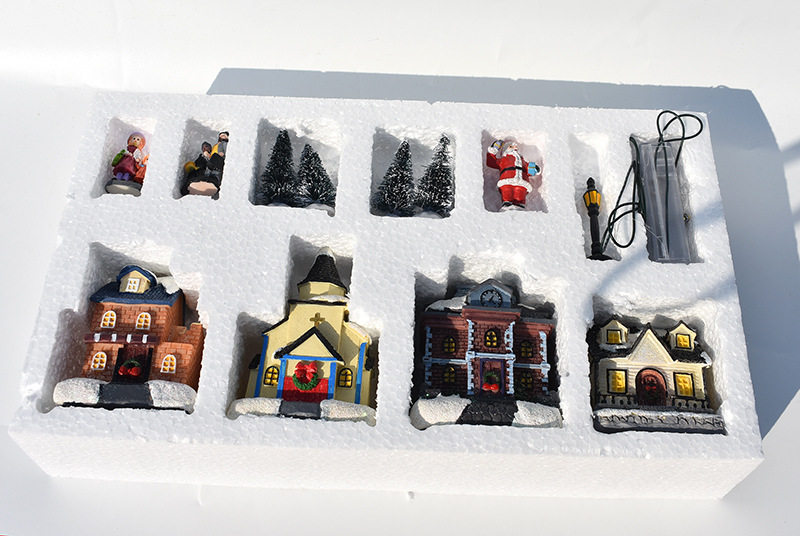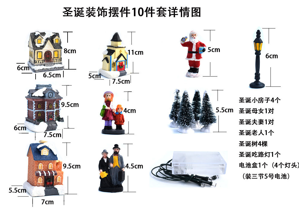 Компоненты продукта: 4 дома, 1 пара рождественских матерей и дочери, 1 пара рождественских пар, 1 Санта, 4 рождественские елки, 1 уличные фонари, 1 ящик для аккумулятора (4 головки лампы), самоподвижные три четверти 5 батарея 5 аккумулятор