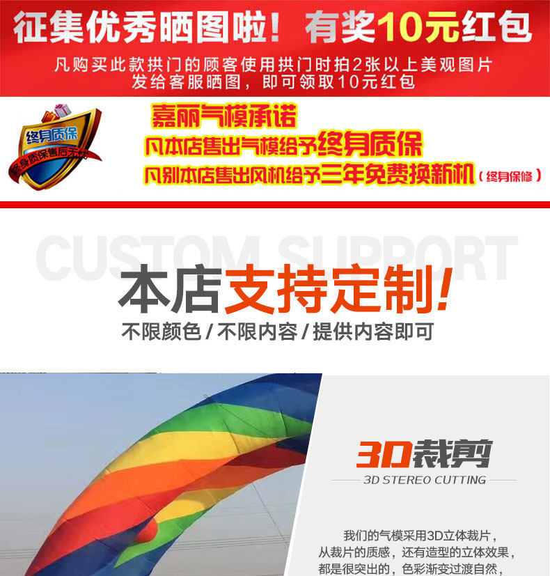 | Цвет: | 6-метровая красочная арка без вентилятора, 8-метровая красочная арка без вентилятора, 10-метровая красочная арка без вентилятора, 12-метровая красочная арка без вентилятора, 15-метровая красочная арка без вентилятора, 18-метровая красочная арка без вентилятора, 6-метровая красочная арка с вентилятором, 8-метровая красочная арка с вентилятором, 10-метровая красочная арка с вентилятором, 12-метровая красочная арка с вентилятором, 15-метровая красочная арка с вентилятором, 18-метровая красочная арка с вентилятором, Красочная арка со световой полосой 10 юаней за метр., 6-8 метровая разноцветная арка с буквами, Красочная арка с буквами высотой 10-18 метров. |