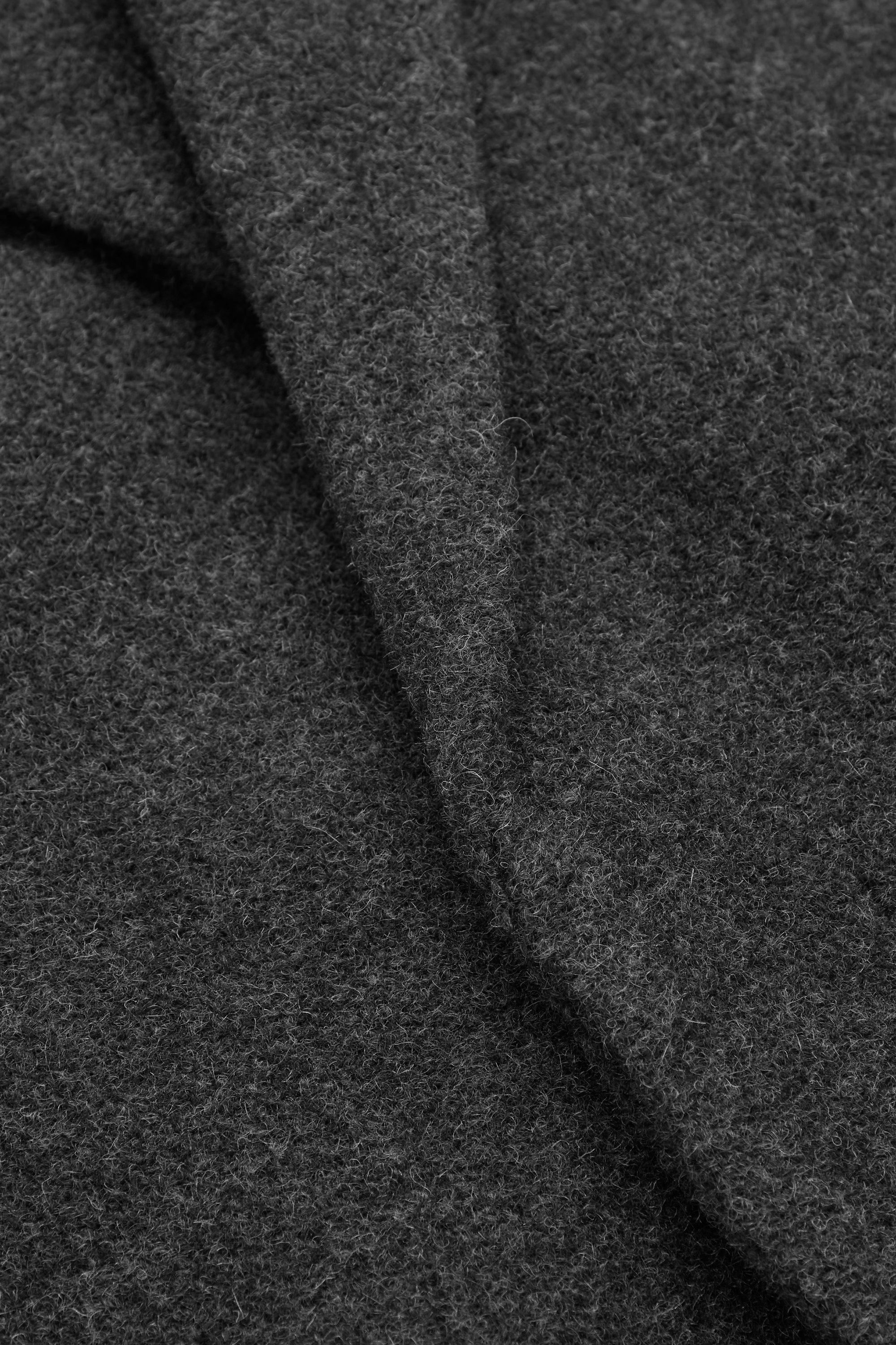 Это пальто изготовлено из шерстяной ткани с тонкой войлочной текстурой на поверхности. Он принимает перекрывающуюся конструкцию воротника.