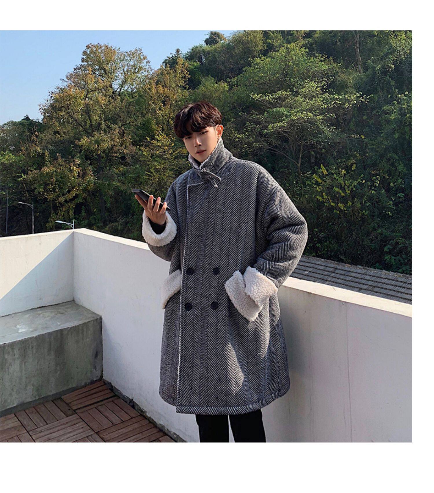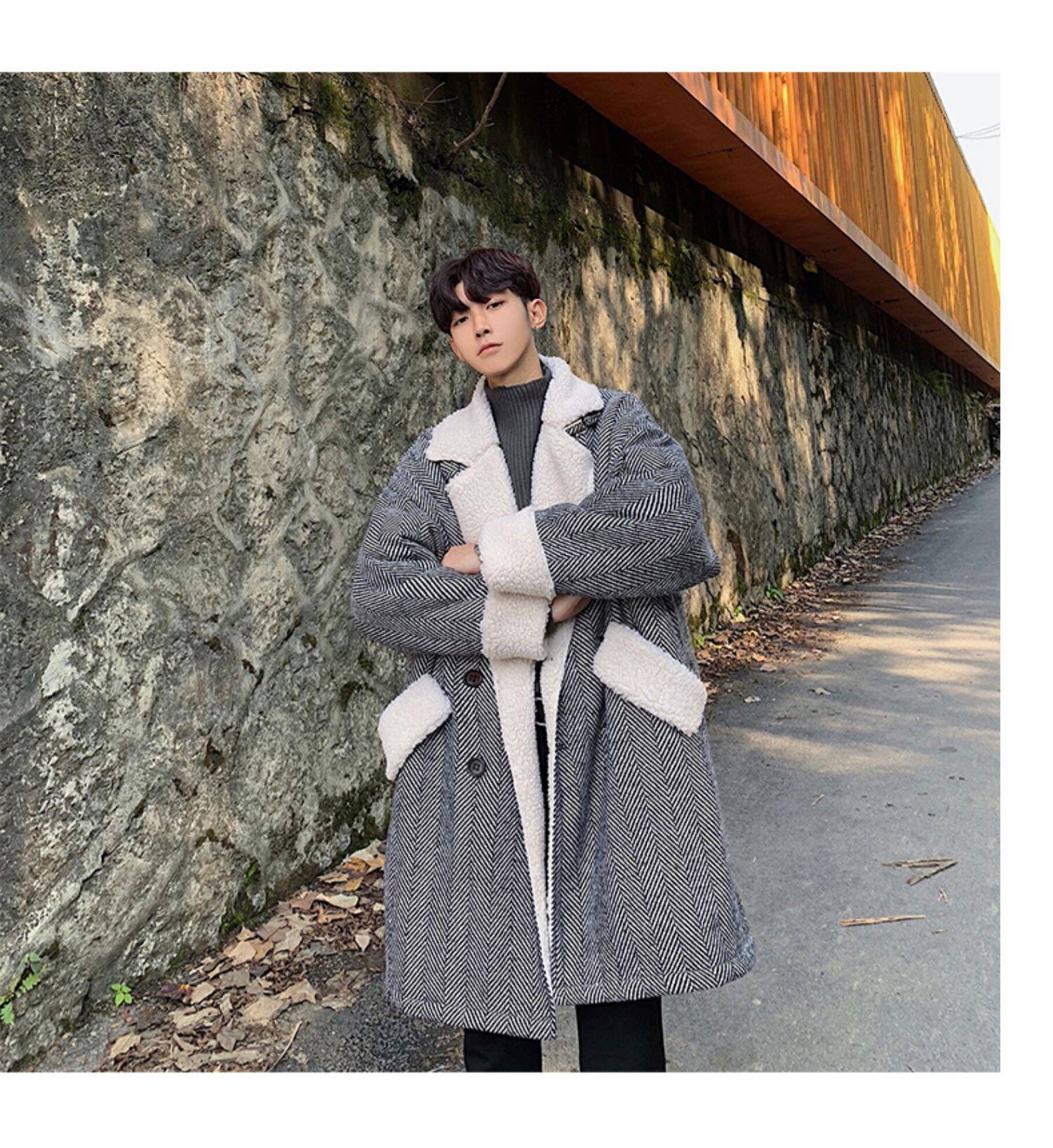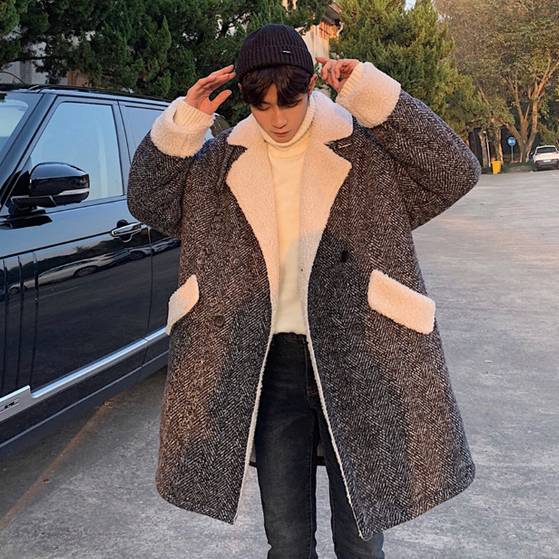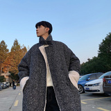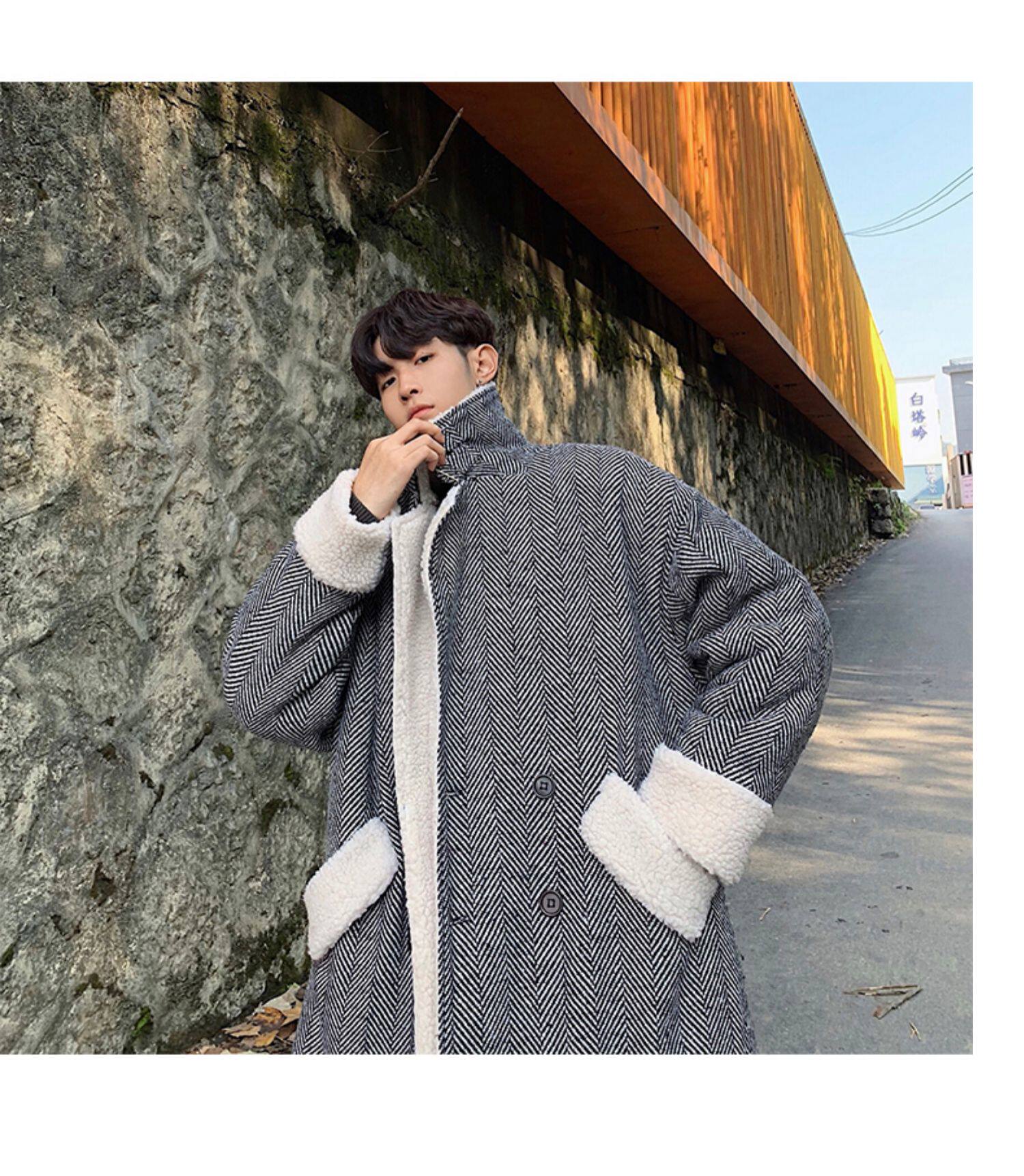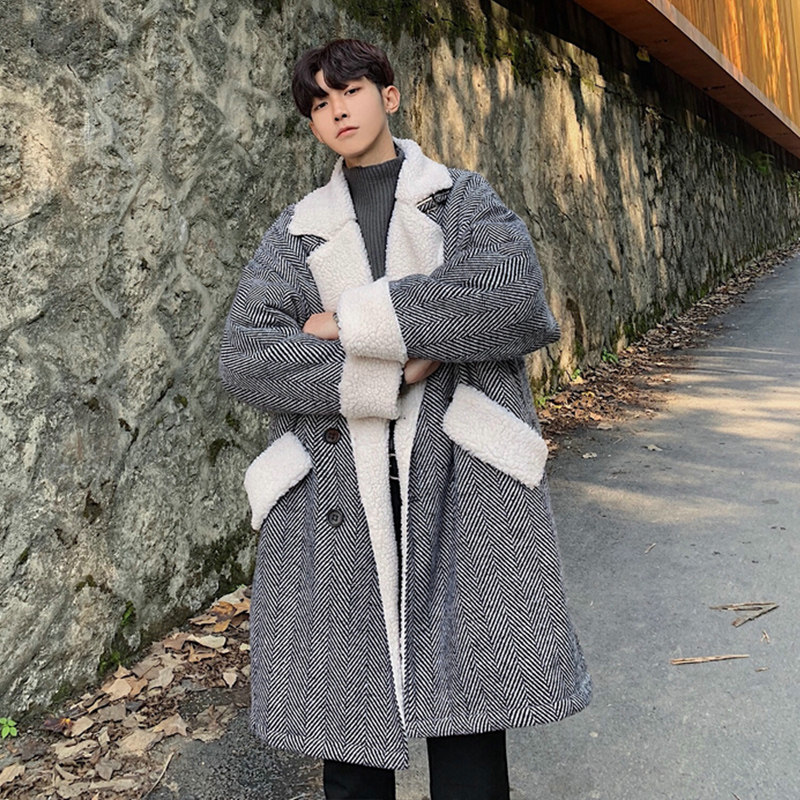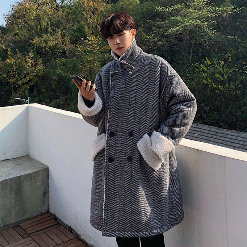 Длинное шерстяное пальто для мальчиков, утепленные джинсы с начесом, демисезонный трендовый ретро плащ, в корейском стиле