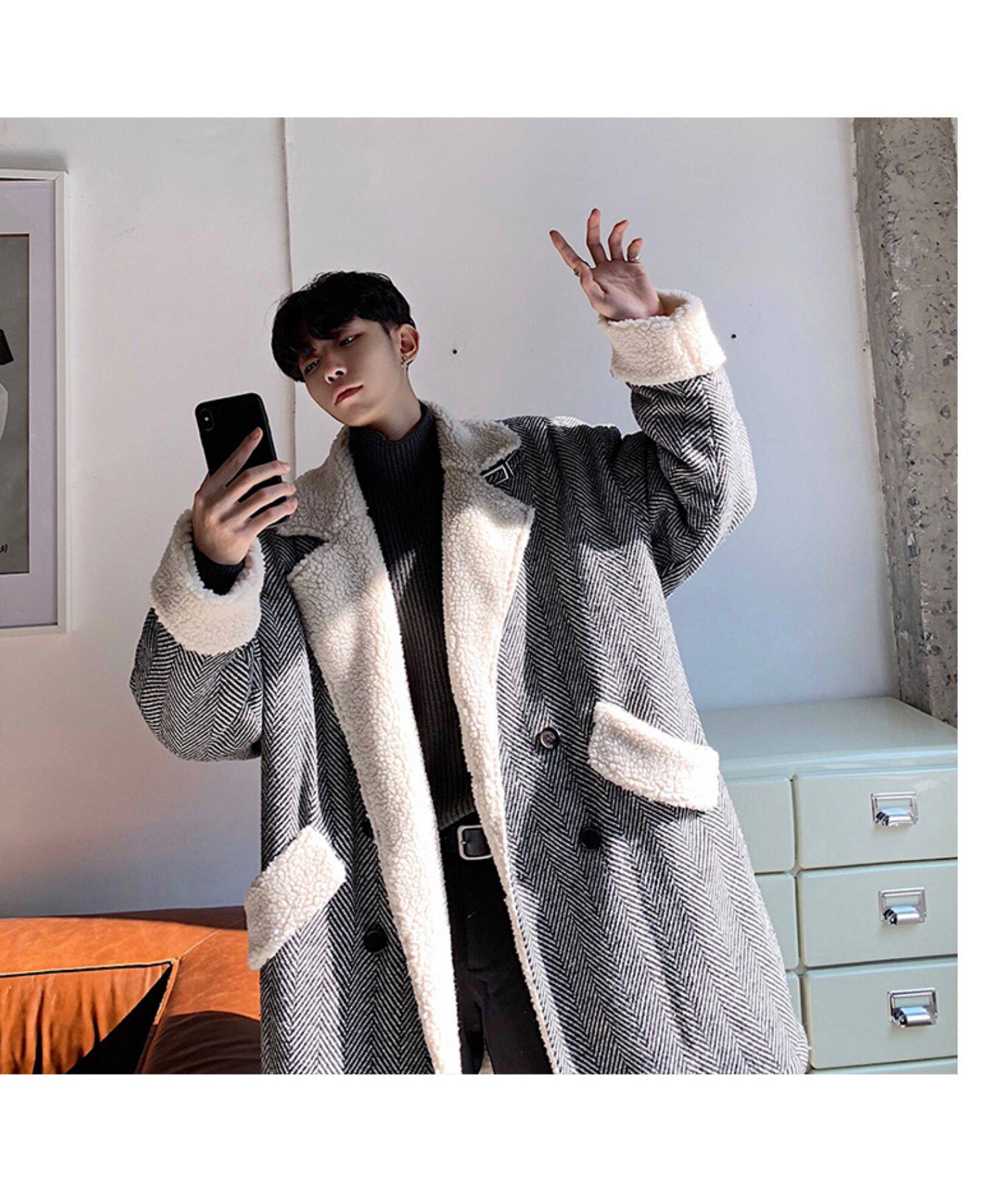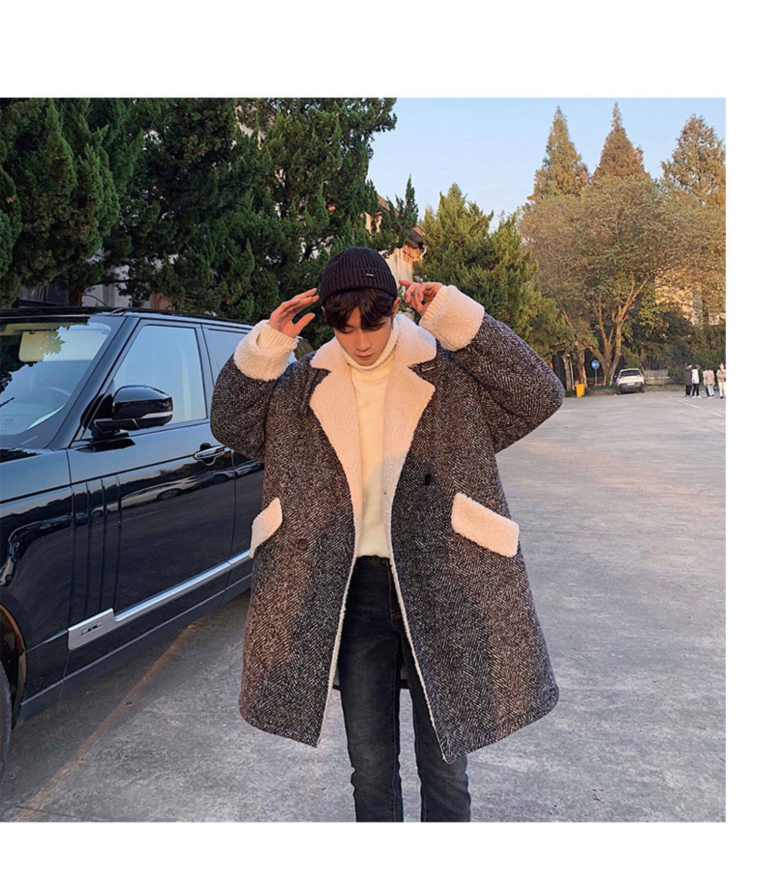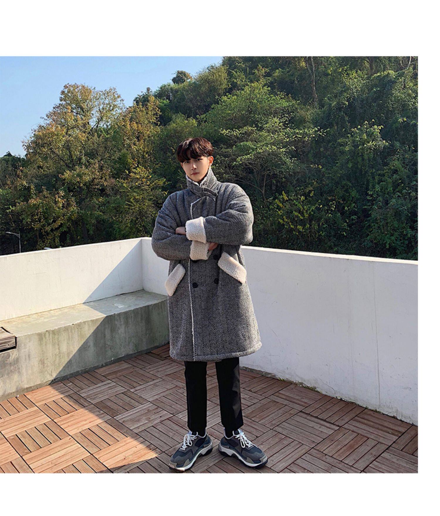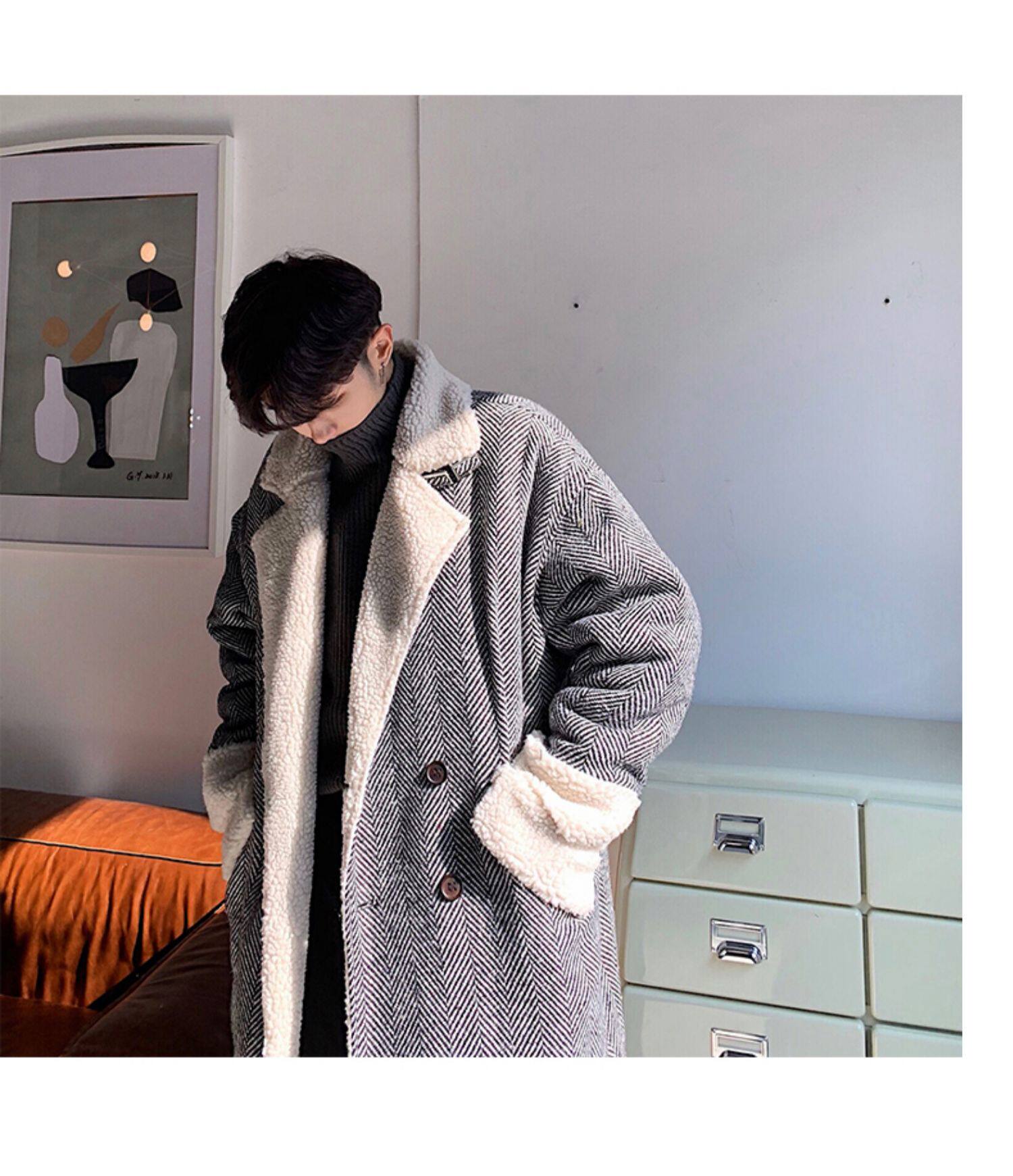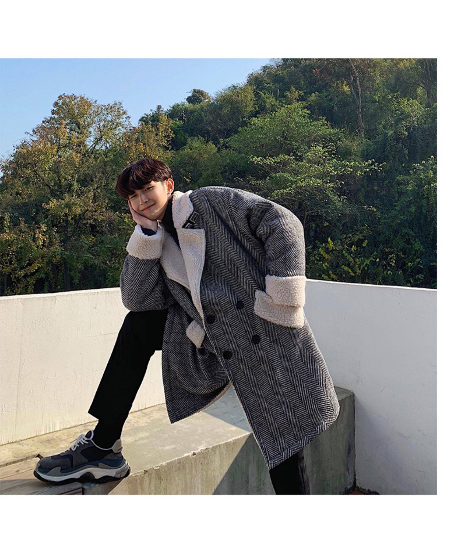Длинное шерстяное пальто для мальчиков, утепленные джинсы с начесом, демисезонный трендовый ретро плащ, в корейском стиле