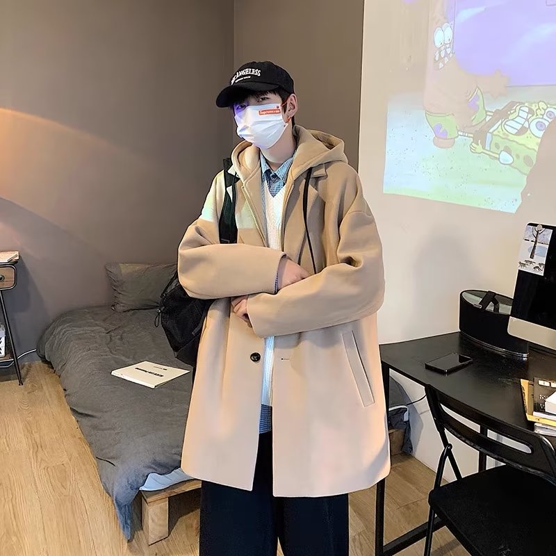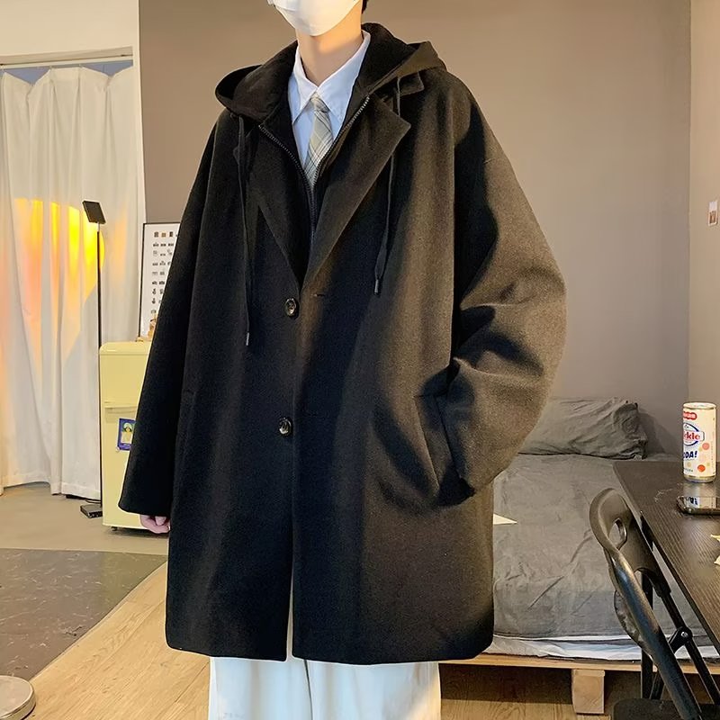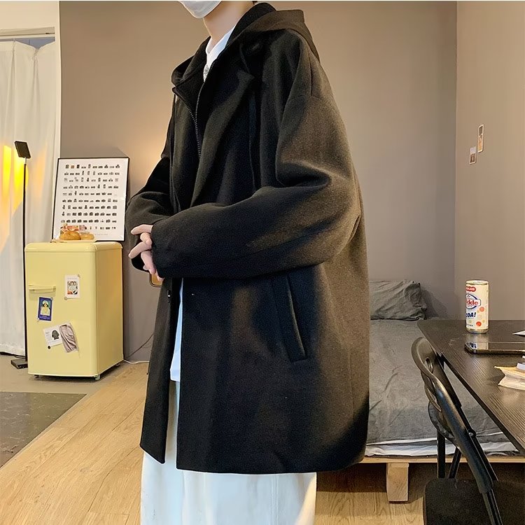 Демисезонное шерстяное пальто, японская ретро толстовка с капюшоном, куртка, черный комплект, плащ, увеличенная толщина