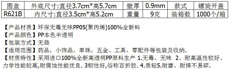 R621B Jianhua Прозрачная круглая коробка 20G PP Пластиковая коробка Круглая крышка резьбы маленькая бутылочная контактная коробка