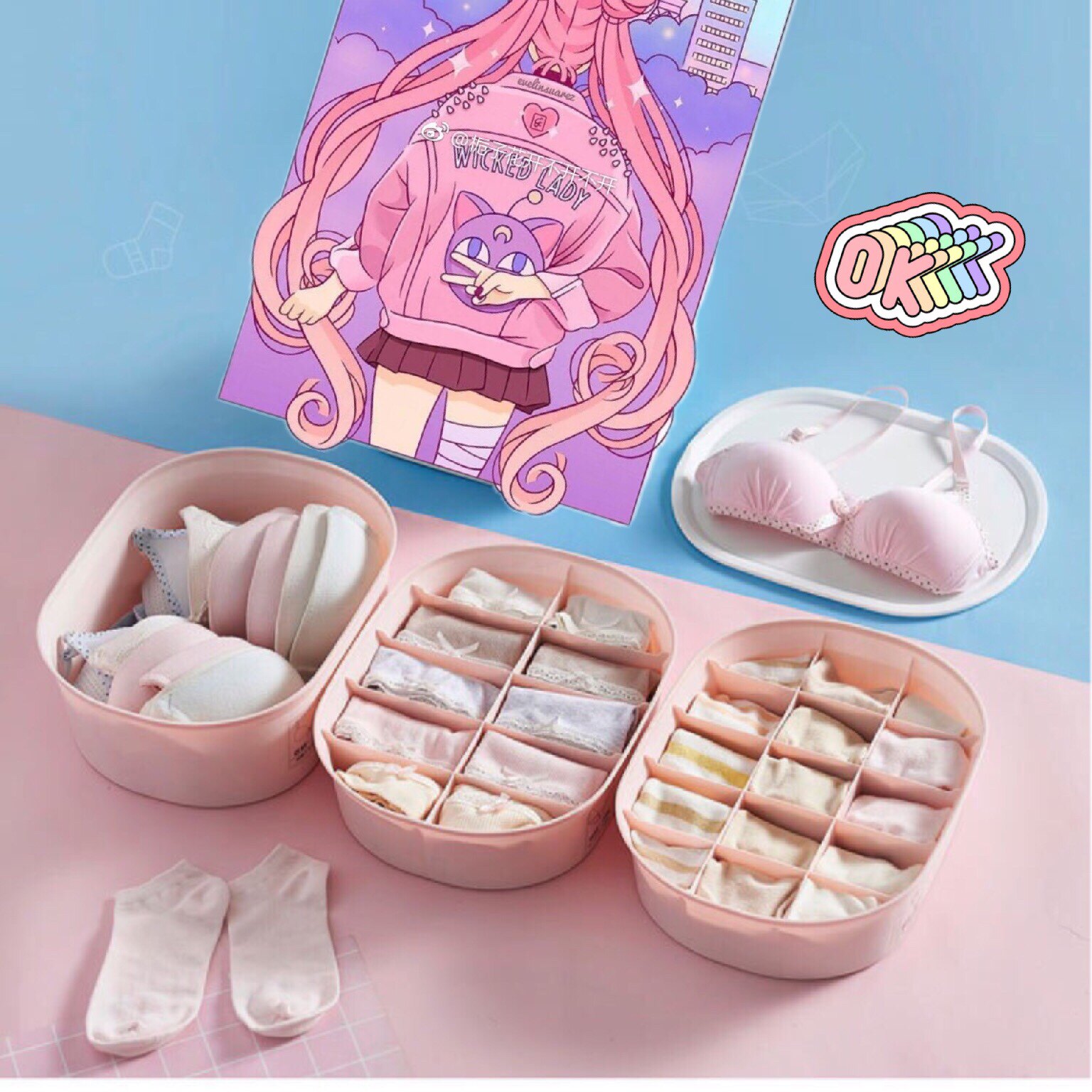 Розовое нижнее белье, коробка для хранения, бюстгалтер, носки, система хранения, комплект, 3 предмета