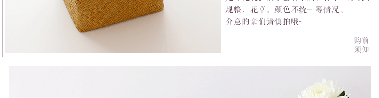 Натуральные материалы, вручную ткачество, и трудно быть идеальными, а детали неизбежны.Иногда будут маленькие шипы, поворот травы, нерегулярные формы, цветы и растения, а затем снова сфотографировать ~~.Не ополаскивайте водой и не чистите ее жесткой щеткой, вы можете вытереть ее намочку, вентиляцию и высушить ~