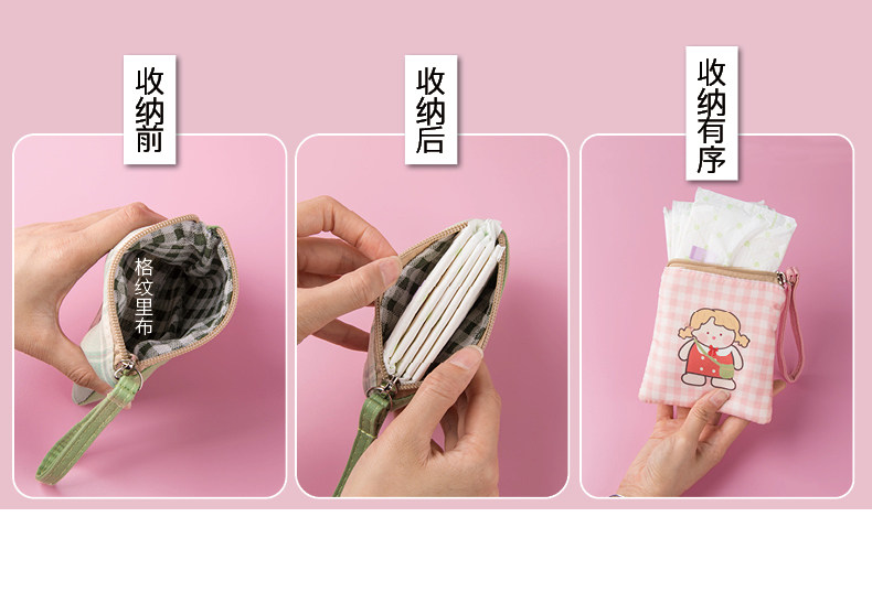 Гигиеническая прокладка, система хранения, небольшая сумка, упаковка, маленькая помада, вместительные и большые салфетки, сумка-органайзер