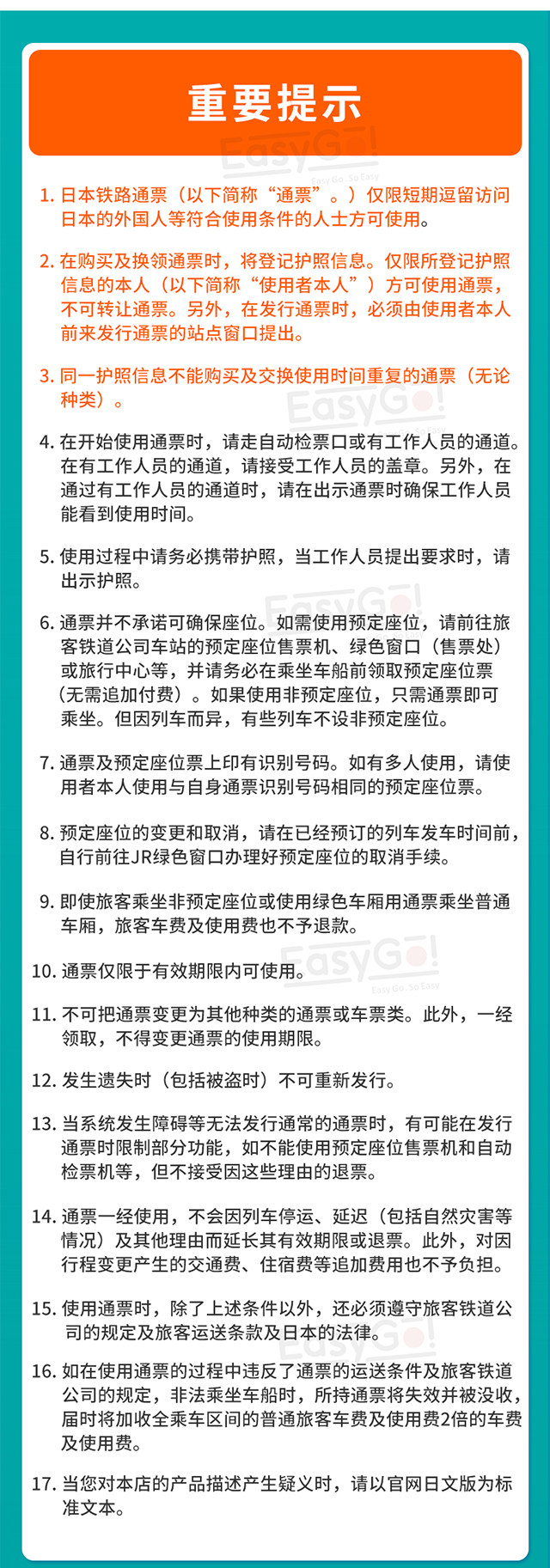 5. Как только вы начнете его использовать, вы не сможете запросить продление срока действия Japan Rail Pass или запросить возврат средств из-за остановок поездов, задержек и т. д. Кроме того, вы не будете нести ответственность за дополнительные расходы, такие как транспортные расходы, плата за проживание и т. д. в связи с изменениями в маршруте.