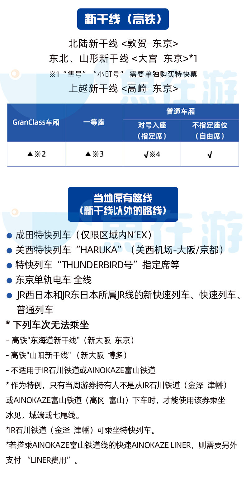 Хокурику Синкансэн (из Токио в Канадзаву), ограниченное количество экспрессов, скоростные поезда, пригородные поезда JR West с зарезервированными местами