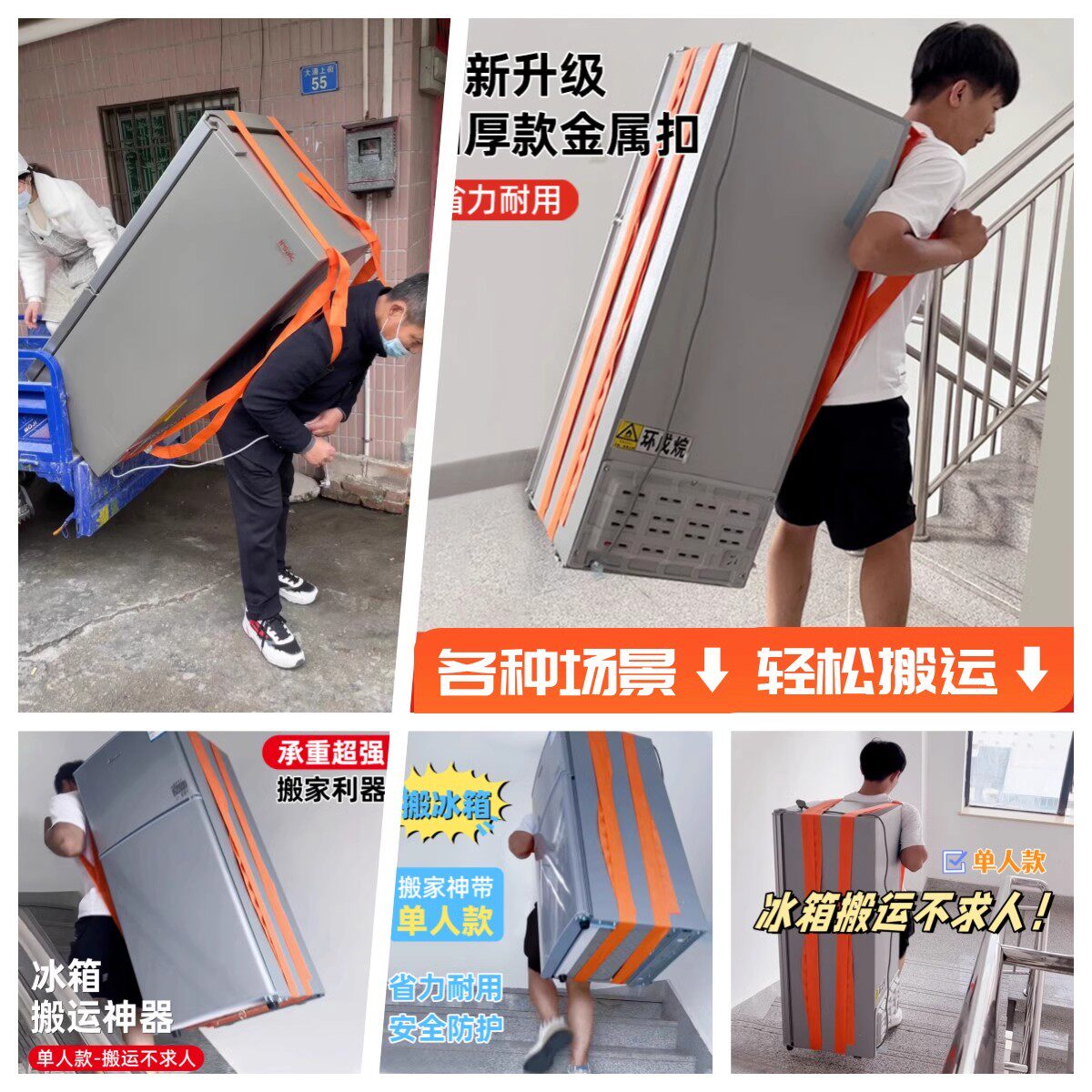 Перемещение артефактов холодильника наверх и вниз по лестнице, чтобы перемещать товарные веревки, перемещая плечевой ремешок, чтобы поднять большой кусок шкафа, несущего строительный инструмент