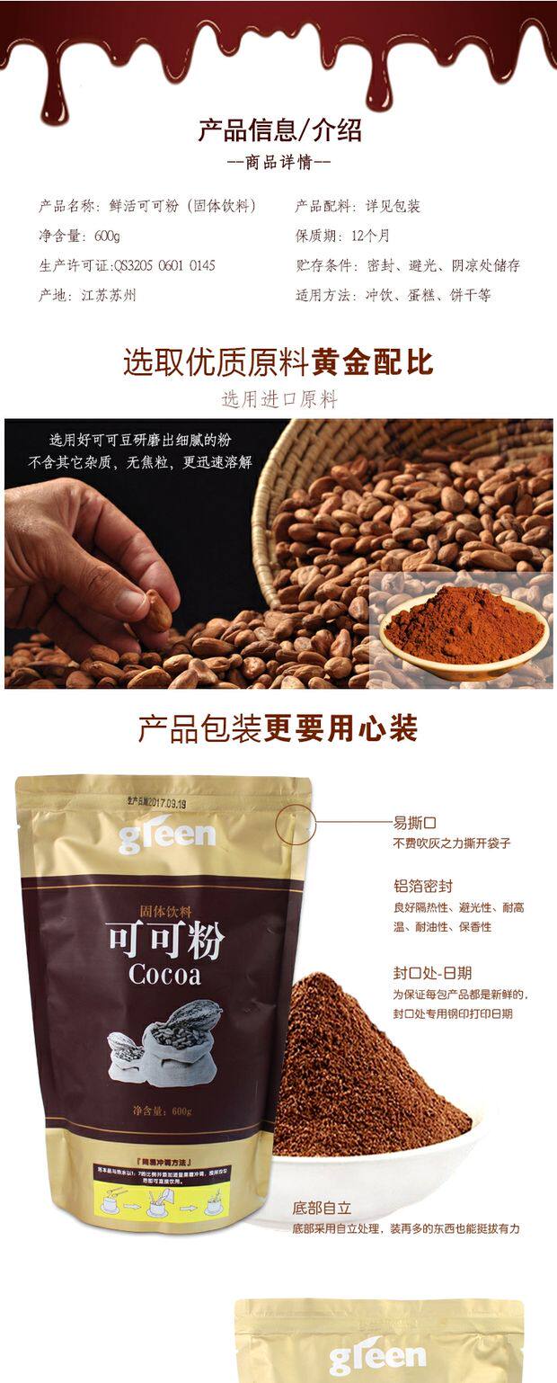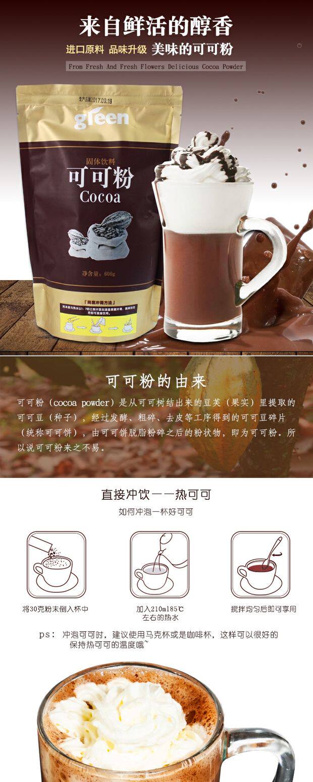 Свежий какао -порошок твердый напиток шоколадный порошок 600 г кофе -молоко чай для выпечки сырья Свежий зеленый какао -порошок