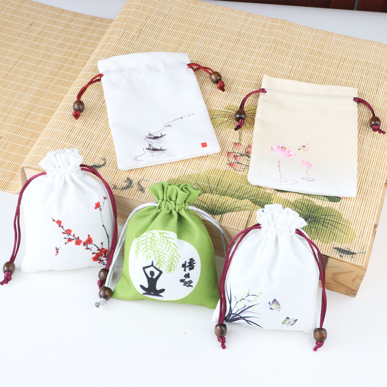 Тканевый мешок, сумка, четки из круглых бусин, китайский стиль, ручная роспись, делается под заказ, с печатью вашего логотипа