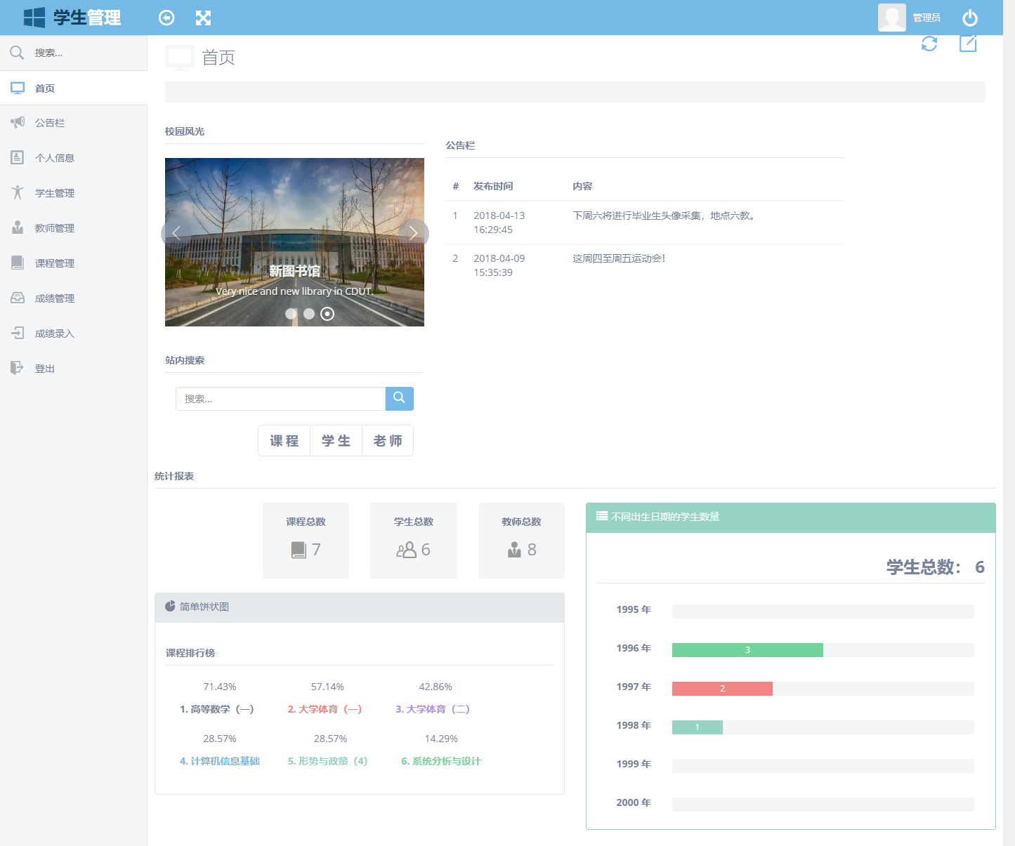 (9) Администраторы могут использовать функцию поиска для поиска соответствующей информации курса, соответствующей информации студентов и соответствующей информации учителя.