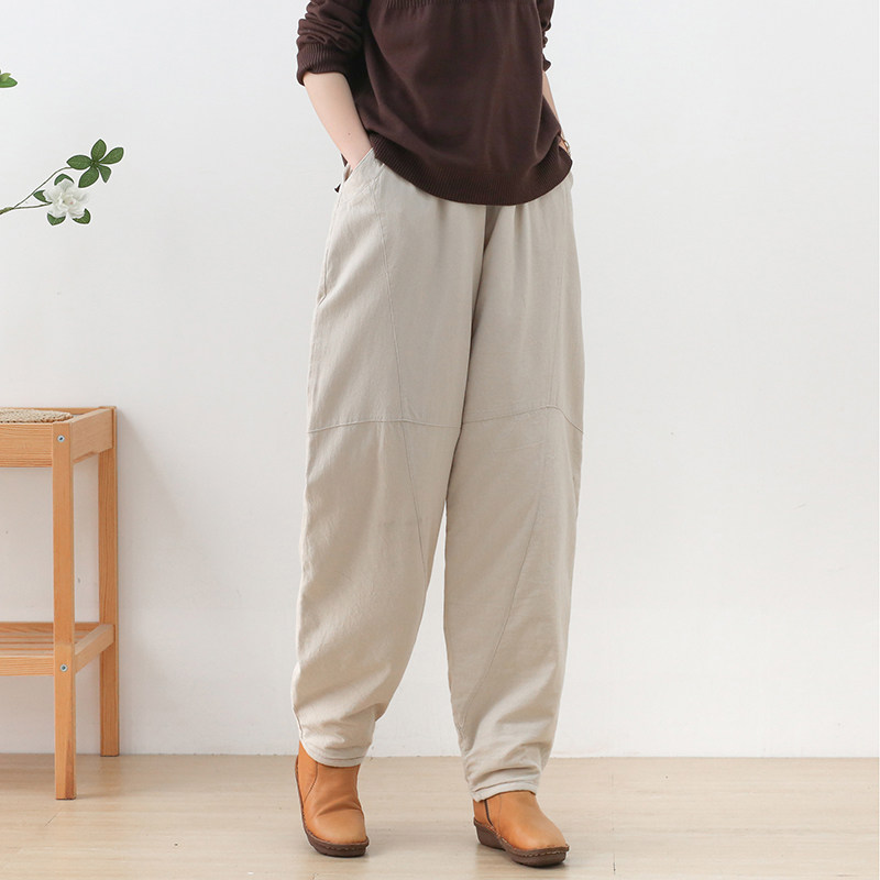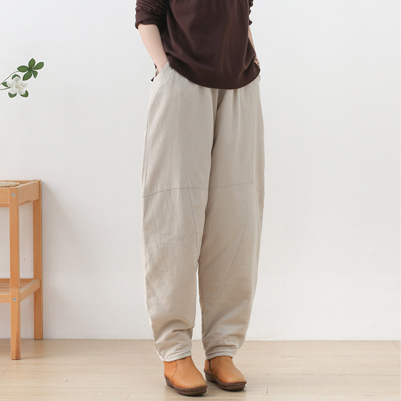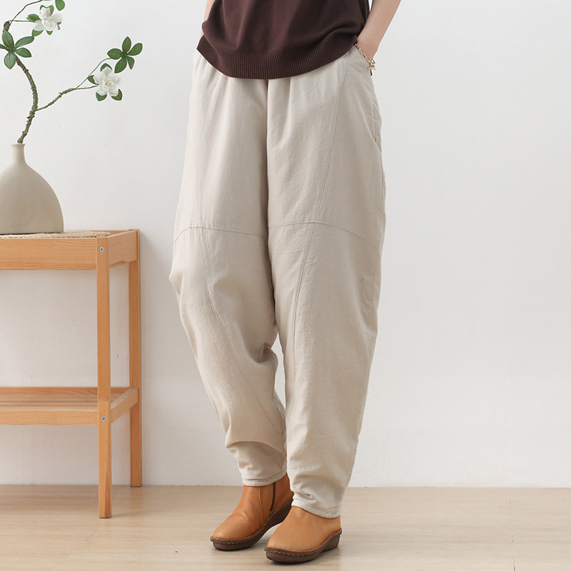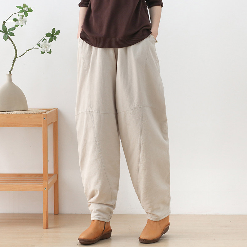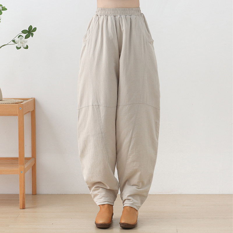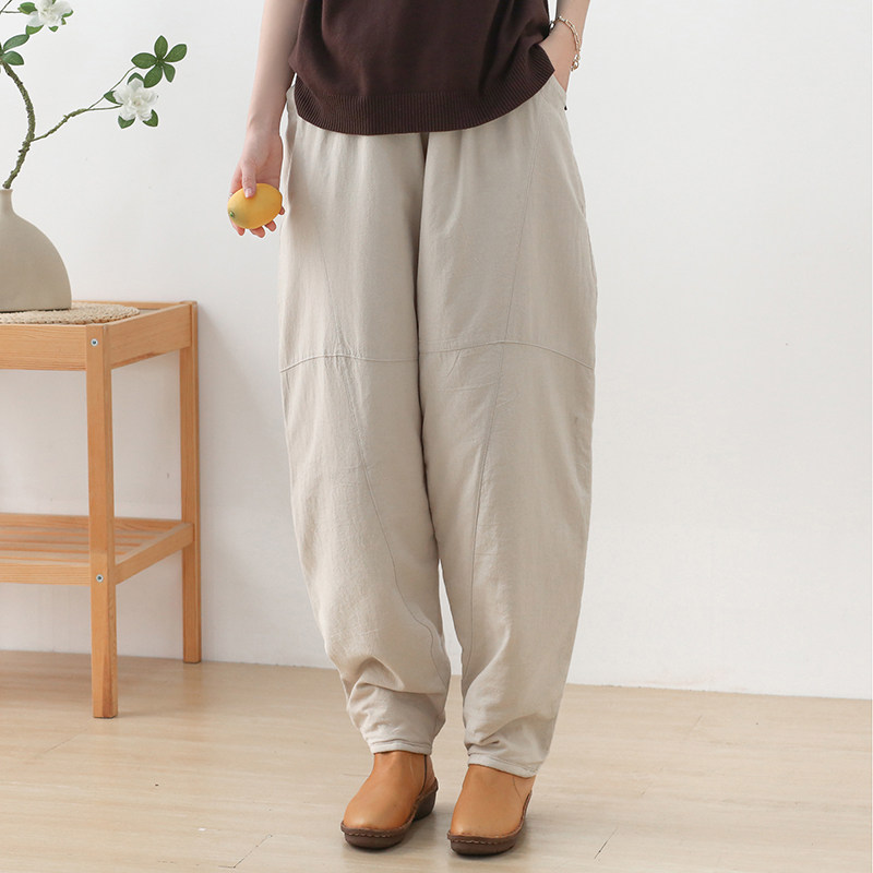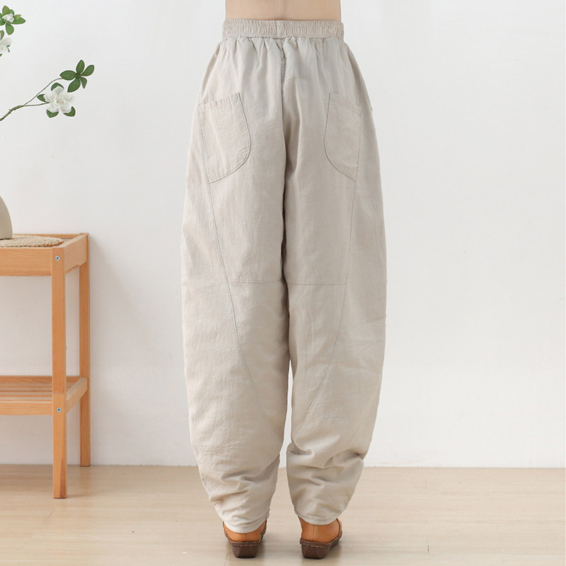 Зимние стеганые штаны, фонарь, высокая талия, увеличенная толщина, из хлопка и льна, большой размер