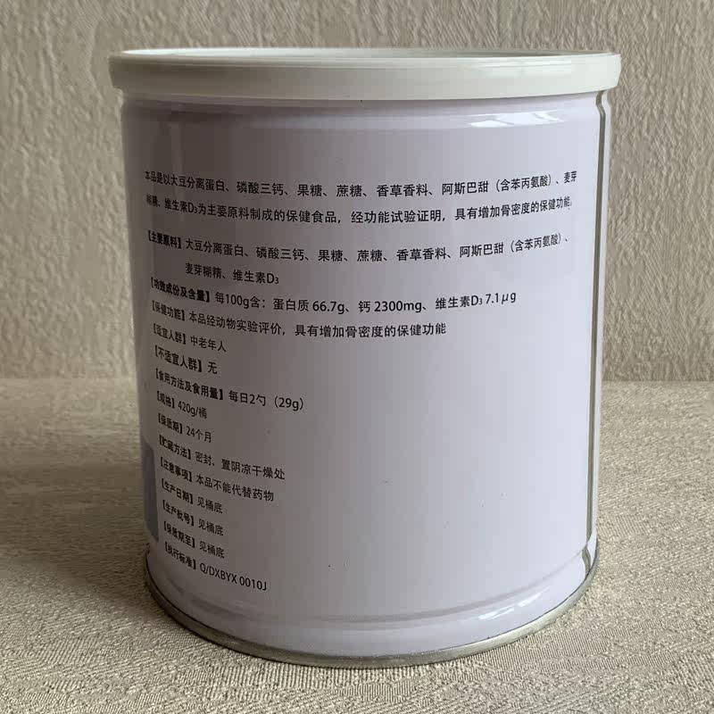 Этот продукт отделен от белка сои, тригджиин, фруктозы, сахарозы, ванильных специй, сладкого ASBA (содержащий фенилаланин), солодовая паста, витамин D3Здравоохранение, изготовленное из основного сырья, доказало, что она имеет функцию здоровья, которая увеличивает плотность кости в результате функционального теста.